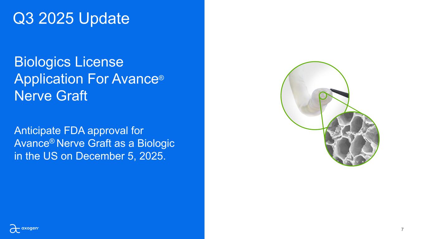 6 Clinical Research • Level 1 study protocol for implant based neurotization • Avance® vs. Autograft evidence plan in mixed & motor nerves. • OMF/H&N clinical evidence plan Innovation • Therapeutic reconstruction • Ease of coaptation • Protection expansion Prostate Clinical & Market Development • AAHS and ASRM recognizes Avance® Nerve Graft as standard medical practice in Q3 • 339 peer-reviewed articles, +10 in Q3 • ~1.1M est. additional covered lives added in Q3; ~18.1M est. new lives YTD Standard of Care • 10 active clinical sites; +4 in Q3 • Procedures underway • Goal of 100 procedures by year-end • Clinical development team hired 2025 Q3 Key Metrics Update Q3 2025 Recent Business Highlights