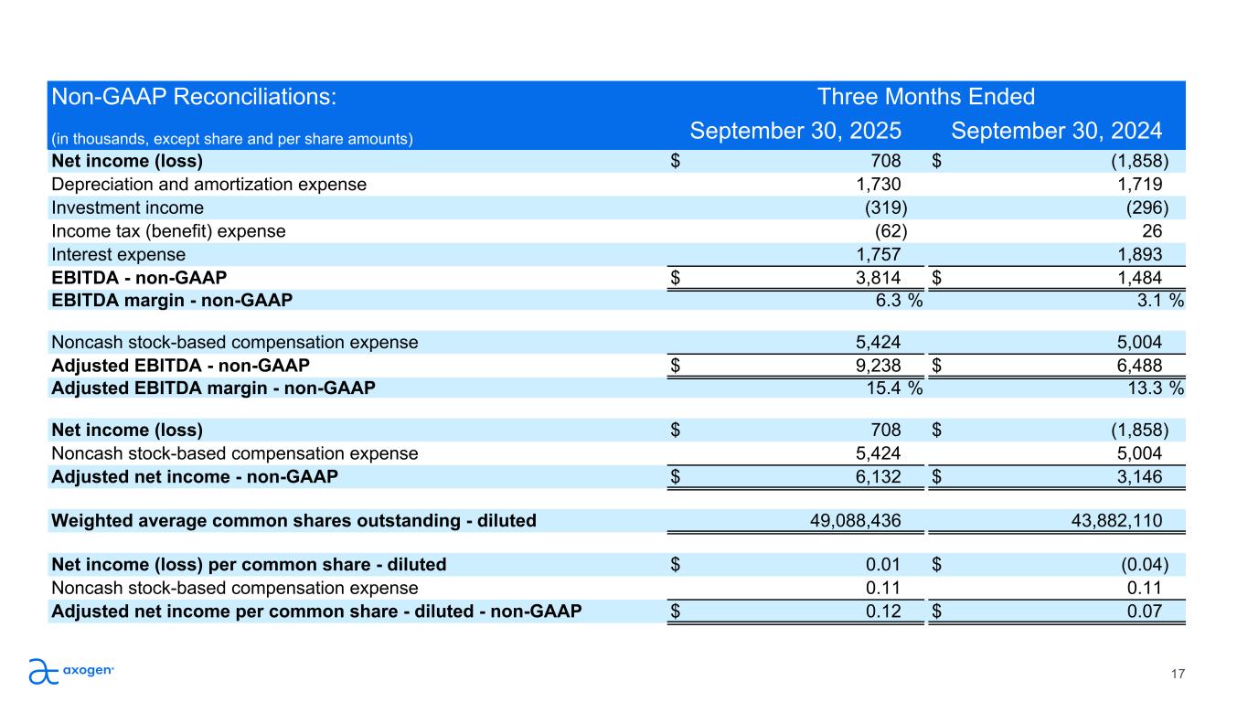 17 Non-GAAP Reconciliations: Three Months Ended (in thousands, except share and per share amounts) September 30, 2025 September 30, 2024 Net income (loss) $ 708 $ (1,858) Depreciation and amortization expense 1,730 1,719 Investment income (319) (296) Income tax (benefit) expense (62) 26 Interest expense 1,757 1,893 EBITDA - non-GAAP $ 3,814 $ 1,484 EBITDA margin - non-GAAP 6.3 % 3.1 % Noncash stock-based compensation expense 5,424 5,004 Adjusted EBITDA - non-GAAP $ 9,238 $ 6,488 Adjusted EBITDA margin - non-GAAP 15.4 % 13.3 % Net income (loss) $ 708 $ (1,858) Noncash stock-based compensation expense 5,424 5,004 Adjusted net income - non-GAAP $ 6,132 $ 3,146 Weighted average common shares outstanding - diluted 49,088,436 43,882,110 Net income (loss) per common share - diluted $ 0.01 $ (0.04) Noncash stock-based compensation expense 0.11 0.11 Adjusted net income per common share - diluted - non-GAAP $ 0.12 $ 0.07