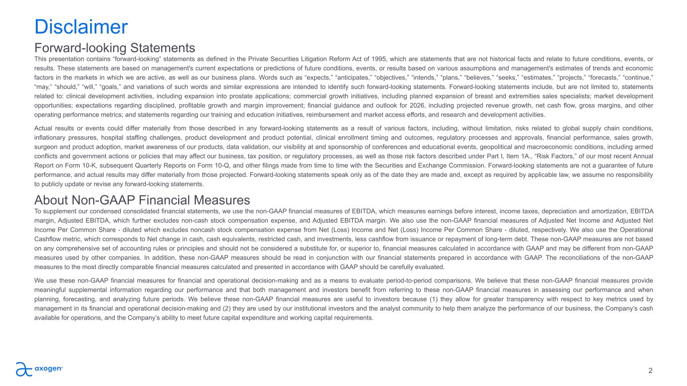 Disclaimer 2 Forward-looking Statements This presentation contains “forward-looking” statements as defined in the Private Securities Litigation Reform Act of 1995, which are statements that are not historical facts and relate to future conditions, events, or results. These statements are based on management's current expectations or predictions of future conditions, events, or results based on various assumptions and management's estimates of trends and economic factors in the markets in which we are active, as well as our business plans. Words such as “expects,” “anticipates,” “objectives,” “intends,” “plans,” “believes,” “seeks,” “estimates,” “projects,” “forecasts,” “continue,” “may,” “should,” “will,” “goals,” and variations of such words and similar expressions are intended to identify such forward-looking statements. Forward-looking statements include, but are not limited to, statements related to: clinical development activities, including expansion into prostate applications; commercial growth initiatives, including planned expansion of breast and extremities sales specialists; market development opportunities; expectations regarding disciplined, profitable growth and margin improvement; financial guidance and outlook for 2026, including projected revenue growth, net cash flow, gross margins, and other operating performance metrics; and statements regarding our training and education initiatives, reimbursement and market access efforts, and research and development activities. Actual results or events could differ materially from those described in any forward-looking statements as a result of various factors, including, without limitation, risks related to global supply chain conditions, inflationary pressures, hospital staffing challenges, product development and product potential, clinical enrollment timing and outcomes, regulatory processes and approvals, financial performance, sales growth, surgeon and product adoption, market awareness of our products, data validation, our visibility at and sponsorship of conferences and educational events, geopolitical and macroeconomic conditions, including armed conflicts and government actions or policies that may affect our business, tax position, or regulatory processes, as well as those risk factors described under Part I, Item 1A., “Risk Factors,” of our most recent Annual Report on Form 10-K, subsequent Quarterly Reports on Form 10-Q, and other filings made from time to time with the Securities and Exchange Commission. Forward-looking statements are not a guarantee of future performance, and actual results may differ materially from those projected. Forward-looking statements speak only as of the date they are made and, except as required by applicable law, we assume no responsibility to publicly update or revise any forward-looking statements. About Non-GAAP Financial Measures To supplement our condensed consolidated financial statements, we use the non-GAAP financial measures of EBITDA, which measures earnings before interest, income taxes, depreciation and amortization, EBITDA margin, Adjusted EBITDA, which further excludes non-cash stock compensation expense, and Adjusted EBITDA margin. We also use the non-GAAP financial measures of Adjusted Net Income and Adjusted Net Income Per Common Share - diluted which excludes noncash stock compensation expense from Net (Loss) Income and Net (Loss) Income Per Common Share - diluted, respectively. We also use the Operational Cashflow metric, which corresponds to Net change in cash, cash equivalents, restricted cash, and investments, less cashflow from issuance or repayment of long-term debt. These non-GAAP measures are not based on any comprehensive set of accounting rules or principles and should not be considered a substitute for, or superior to, financial measures calculated in accordance with GAAP and may be different from non-GAAP measures used by other companies. In addition, these non-GAAP measures should be read in conjunction with our financial statements prepared in accordance with GAAP. The reconciliations of the non-GAAP measures to the most directly comparable financial measures calculated and presented in accordance with GAAP should be carefully evaluated. We use these non-GAAP financial measures for financial and operational decision-making and as a means to evaluate period-to-period comparisons. We believe that these non-GAAP financial measures provide meaningful supplemental information regarding our performance and that both management and investors benefit from referring to these non-GAAP financial measures in assessing our performance and when planning, forecasting, and analyzing future periods. We believe these non-GAAP financial measures are useful to investors because (1) they allow for greater transparency with respect to key metrics used by management in its financial and operational decision-making and (2) they are used by our institutional investors and the analyst community to help them analyze the performance of our business, the Company’s cash available for operations, and the Company’s ability to meet future capital expenditure and working capital requirements.
