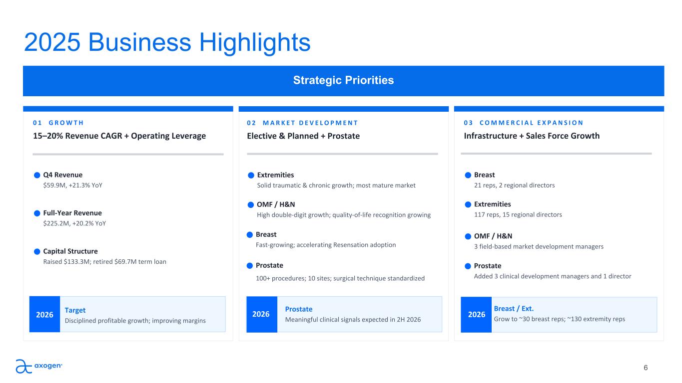 6 Strategic Priorities 2025 Business Highlights 0 1 G R OW TH 15–20% Revenue CAGR + Operating Leverage Q4 Revenue $59.9M, +21.3% YoY Full-Year Revenue $225.2M, +20.2% YoY Capital Structure Raised $133.3M; retired $69.7M term loan 2026 Target Disciplined profitable growth; improving margins 0 2 M A R K E T D E V E L O PM EN T Elective & Planned + Prostate Extremities Solid traumatic & chronic growth; most mature market OMF / H&N High double-digit growth; quality-of-life recognition growing Breast Fast-growing; accelerating Resensation adoption Prostate 100+ procedures; 10 sites; surgical technique standardized 2026 Prostate Meaningful clinical signals expected in 2H 2026 0 3 C OMME R C I A L E X P A N S I O N Infrastructure + Sales Force Growth Breast 21 reps, 2 regional directors Extremities 117 reps, 15 regional directors OMF / H&N 3 field-based market development managers Prostate Added 3 clinical development managers and 1 director 2026 Breast / Ext. Grow to ~30 breast reps; ~130 extremity reps 6