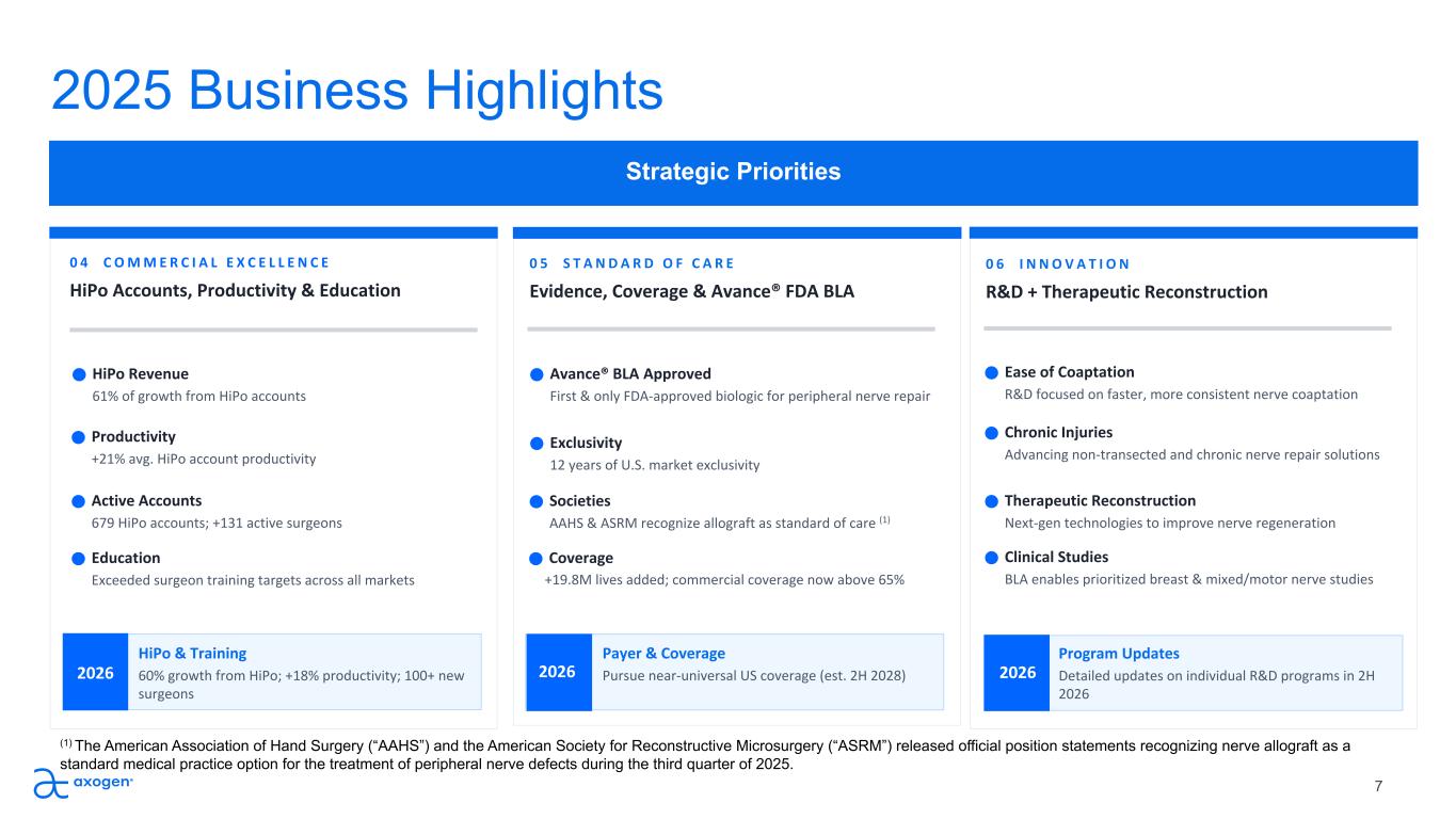 7 Strategic Priorities 2025 Business Highlights 2026 2026 2026 0 4 C OMME R C I A L E X C E L L E N C E HiPo Accounts, Productivity & Education HiPo Revenue 61% of growth from HiPo accounts Productivity +21% avg. HiPo account productivity Active Accounts 679 HiPo accounts; +131 active surgeons Education Exceeded surgeon training targets across all markets HiPo & Training 60% growth from HiPo; +18% productivity; 100+ new surgeons 0 5 S T A N D A R D O F C A R E Evidence, Coverage & Avance® FDA BLA Exclusivity 12 years of U.S. market exclusivity Avance® BLA Approved First & only FDA-approved biologic for peripheral nerve repair Societies AAHS & ASRM recognize allograft as standard of care (1) Coverage +19.8M lives added; commercial coverage now above 65% Payer & Coverage Pursue near-universal US coverage (est. 2H 2028) 0 6 I N NO V A T I O N R&D + Therapeutic Reconstruction Program Updates Detailed updates on individual R&D programs in 2H 2026 Ease of Coaptation R&D focused on faster, more consistent nerve coaptation Chronic Injuries Advancing non-transected and chronic nerve repair solutions Therapeutic Reconstruction Next-gen technologies to improve nerve regeneration Clinical Studies BLA enables prioritized breast & mixed/motor nerve studies 7 (1) The American Association of Hand Surgery (“AAHS”) and the American Society for Reconstructive Microsurgery (“ASRM”) released official position statements recognizing nerve allograft as a standard medical practice option for the treatment of peripheral nerve defects during the third quarter of 2025.