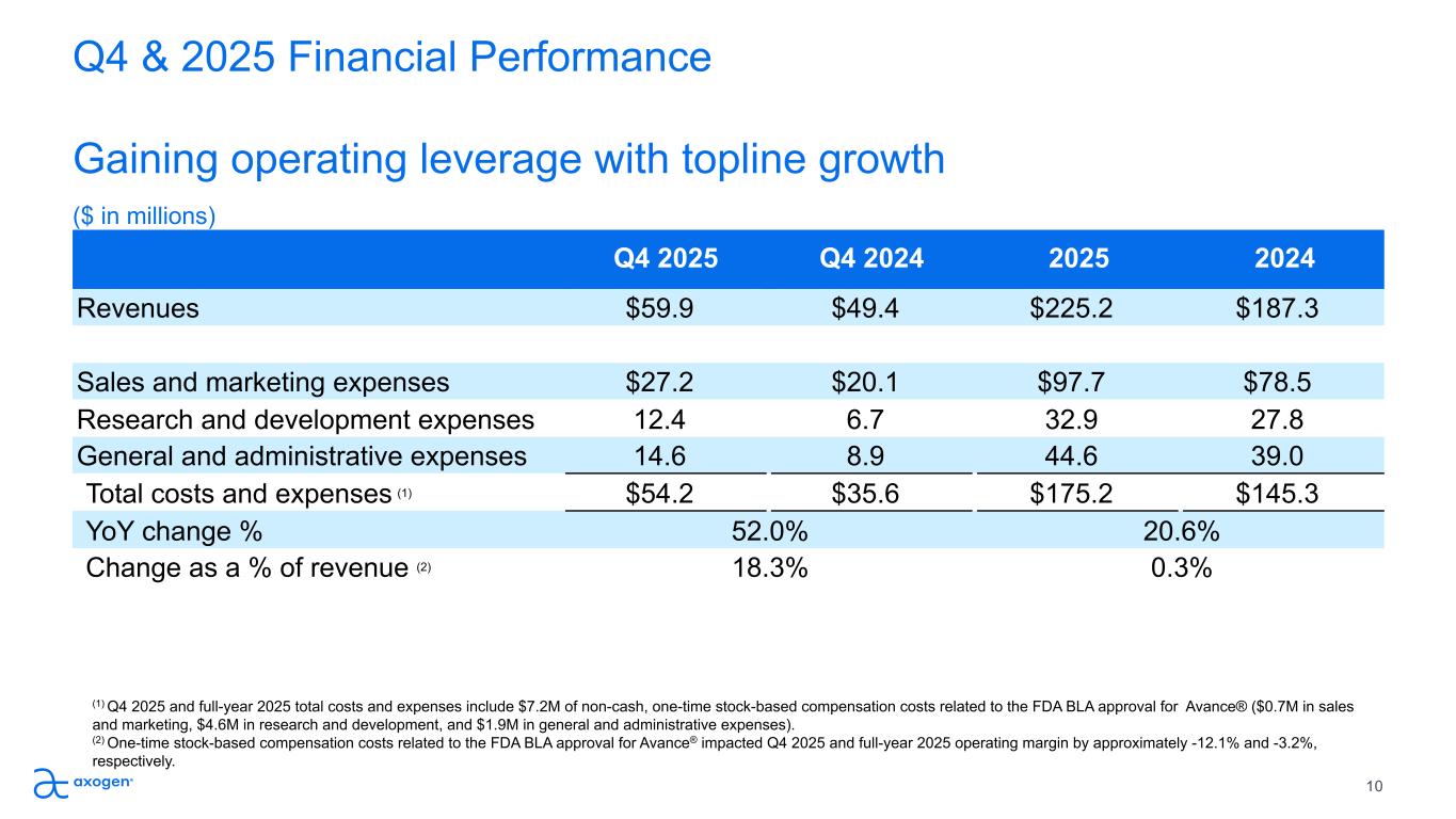 Q4 & 2025 Financial Performance 9 Q4 & 2025 Revenue ($ in millions) $49.4 $187.3 $59.9 $225.2 2024 2025 Q4 Annual $— $40.0 $80.0 $120.0 $160.0 $200.0 $240.0 Q4 & 2025 Gross Margin % 76.1% 75.8% 74.1% 74.3% 2024 2025 Q4 Annual 73.0% 73.5% 74.0% 74.5% 75.0% 75.5% 76.0% 76.5% -2pp+21.3% (1) Q4 2025 and full-year 2025 include $1.9M of one-time costs, of which $1.3M is non-cash stock-based compensation, related to the U.S. Food and Drug Administration (“FDA”) Biologics License Application (“BLA”) approval of Avance®, impacting gross margin by -3.3% and -0.9%, respectively. (1) -1.5pp+20.2%