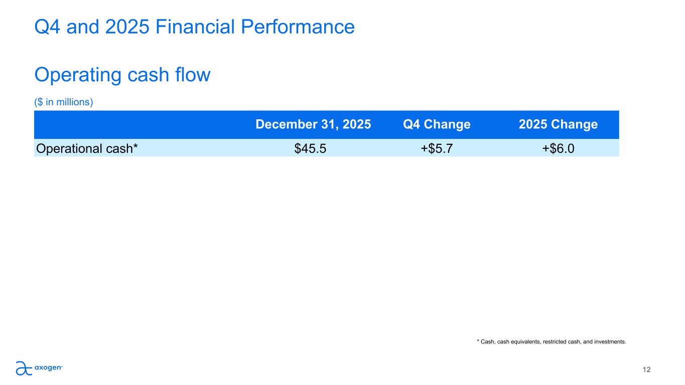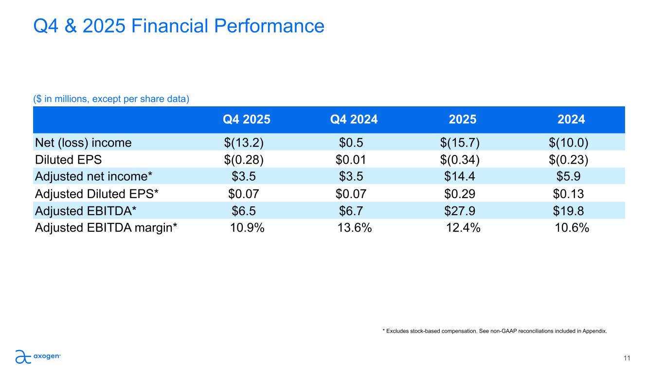 Q4 & 2025 Financial Performance Gaining operating leverage with topline growth ($ in millions) 10 Q4 2025 Q4 2024 2025 2024 Revenues $59.9 $49.4 $225.2 $187.3 Sales and marketing expenses $27.2 $20.1 $97.7 $78.5 Research and development expenses 12.4 6.7 32.9 27.8 General and administrative expenses 14.6 8.9 44.6 39.0 Total costs and expenses (1) $54.2 $35.6 $175.2 $145.3 YoY change % 52.0% 20.6% Change as a % of revenue (2) 18.3% 0.3% (1) Q4 2025 and full-year 2025 total costs and expenses include $7.2M of non-cash, one-time stock-based compensation costs related to the FDA BLA approval for Avance® ($0.7M in sales and marketing, $4.6M in research and development, and $1.9M in general and administrative expenses). (2) One-time stock-based compensation costs related to the FDA BLA approval for Avance® impacted Q4 2025 and full-year 2025 operating margin by approximately -12.1% and -3.2%, respectively.