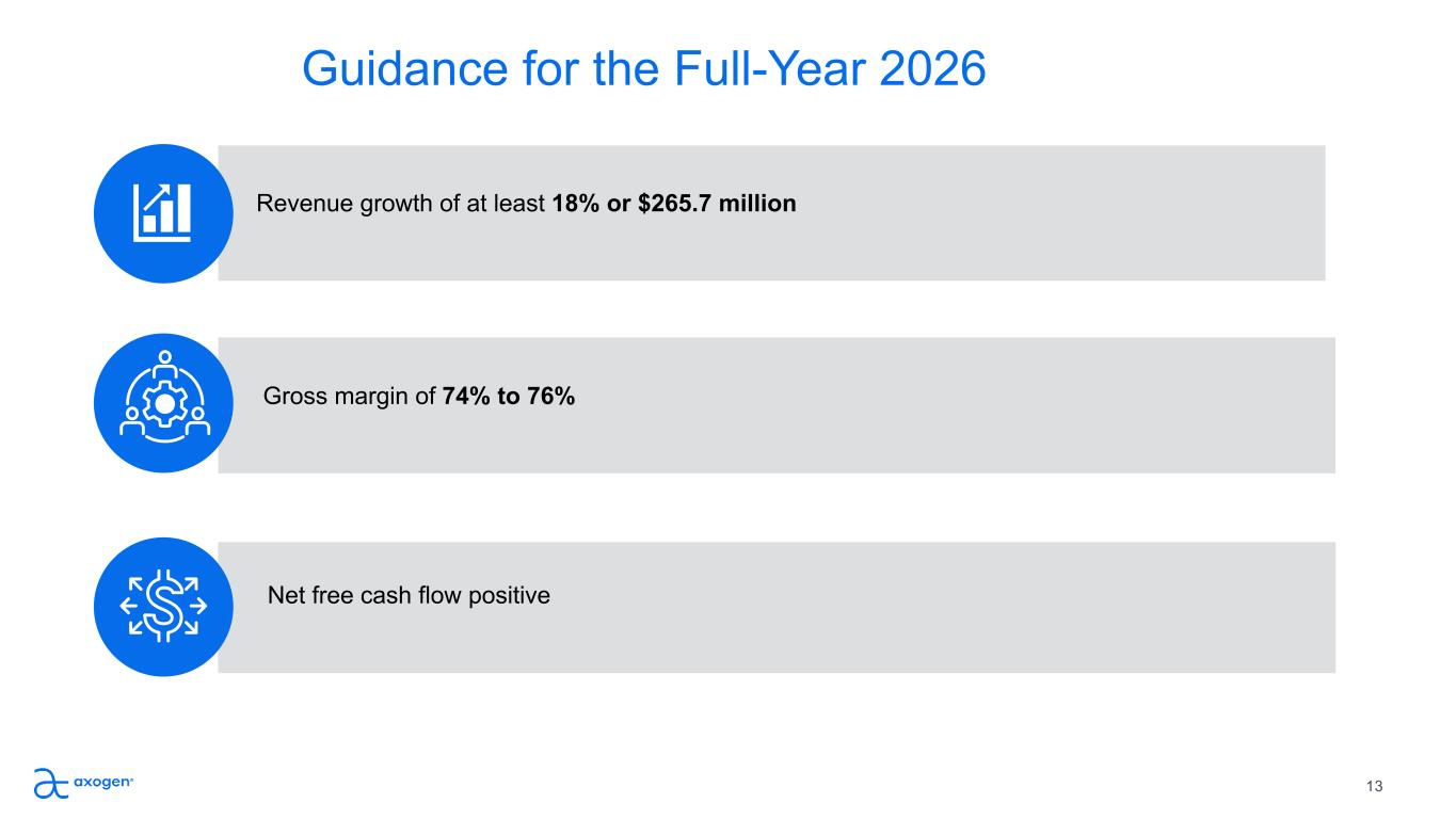 Guidance for the Full-Year 2026 Revenue growth of at least 18% or $265.7 million Gross margin of 74% to 76% Net free cash flow positive 13