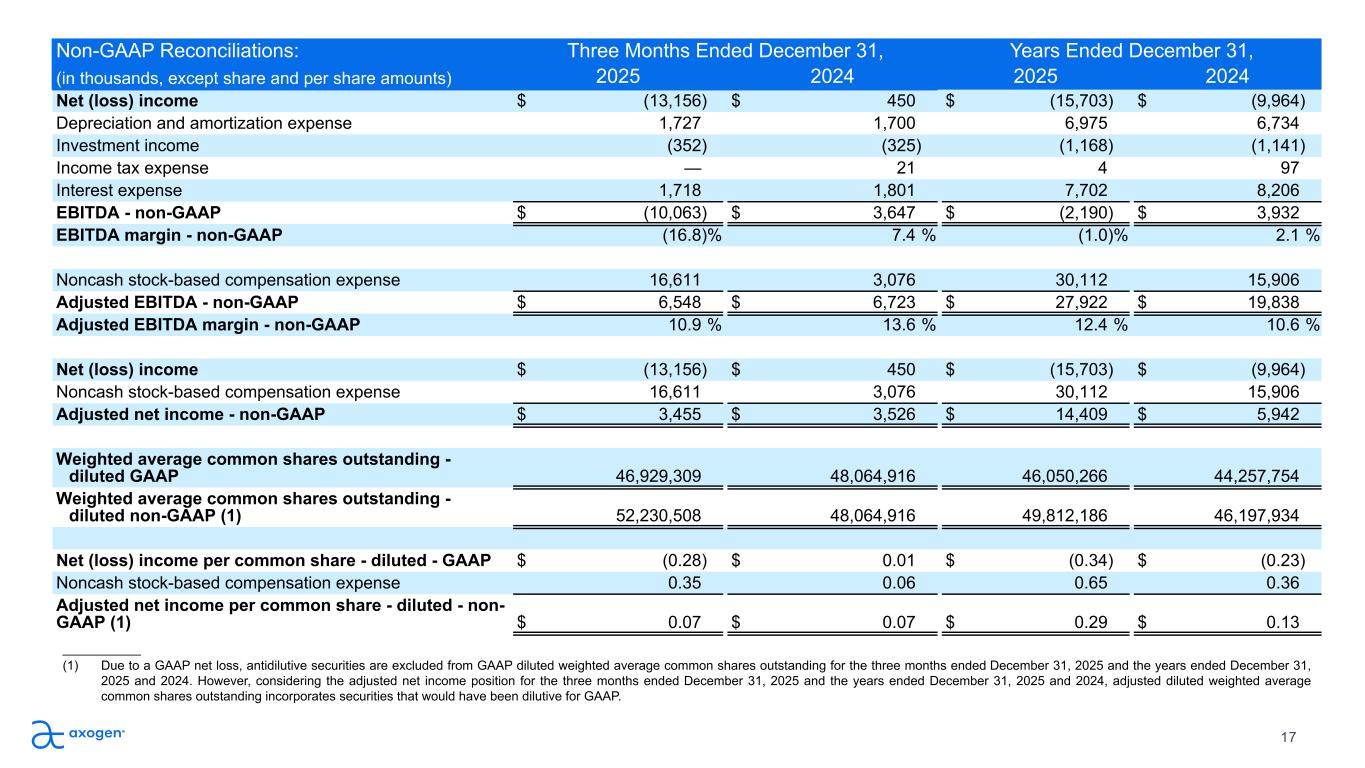 17 Non-GAAP Reconciliations: Three Months Ended December 31, Years Ended December 31, (in thousands, except share and per share amounts) 2025 2024 2025 2024 Net (loss) income $ (13,156) $ 450 $ (15,703) $ (9,964) Depreciation and amortization expense 1,727 1,700 6,975 6,734 Investment income (352) (325) (1,168) (1,141) Income tax expense — 21 4 97 Interest expense 1,718 1,801 7,702 8,206 EBITDA - non-GAAP $ (10,063) $ 3,647 $ (2,190) $ 3,932 EBITDA margin - non-GAAP (16.8) % 7.4 % (1.0) % 2.1 % Noncash stock-based compensation expense 16,611 3,076 30,112 15,906 Adjusted EBITDA - non-GAAP $ 6,548 $ 6,723 $ 27,922 $ 19,838 Adjusted EBITDA margin - non-GAAP 10.9 % 13.6 % 12.4 % 10.6 % Net (loss) income $ (13,156) $ 450 $ (15,703) $ (9,964) Noncash stock-based compensation expense 16,611 3,076 30,112 15,906 Adjusted net income - non-GAAP $ 3,455 $ 3,526 $ 14,409 $ 5,942 Weighted average common shares outstanding - diluted GAAP 46,929,309 48,064,916 46,050,266 44,257,754 Weighted average common shares outstanding - diluted non-GAAP (1) 52,230,508 48,064,916 49,812,186 46,197,934 Net (loss) income per common share - diluted - GAAP $ (0.28) $ 0.01 $ (0.34) $ (0.23) Noncash stock-based compensation expense 0.35 0.06 0.65 0.36 Adjusted net income per common share - diluted - non- GAAP (1) $ 0.07 $ 0.07 $ 0.29 $ 0.13 ___________ (1) Due to a GAAP net loss, antidilutive securities are excluded from GAAP diluted weighted average common shares outstanding for the three months ended December 31, 2025 and the years ended December 31, 2025 and 2024. However, considering the adjusted net income position for the three months ended December 31, 2025 and the years ended December 31, 2025 and 2024, adjusted diluted weighted average common shares outstanding incorporates securities that would have been dilutive for GAAP.