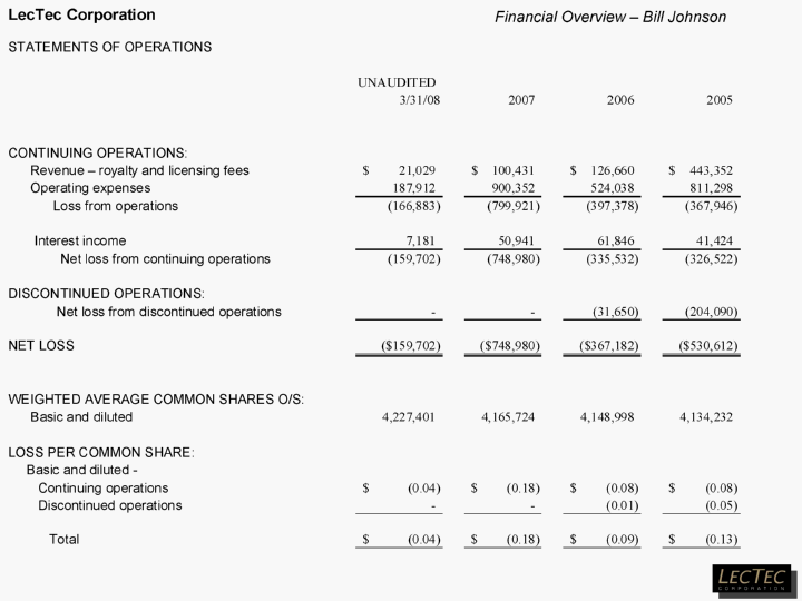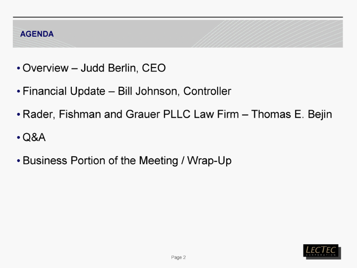 | AGENDA Overview - Judd Berlin, CEO Financial Update - Bill Johnson, Controller Rader, Fishman and Grauer PLLC Law Firm - Thomas E. Bejin Q&A Business Portion of the Meeting / Wrap-Up |