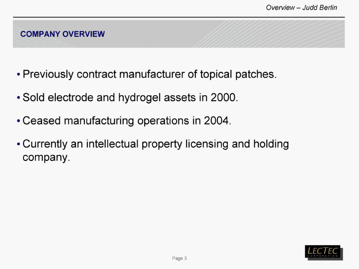 | COMPANY OVERVIEW Previously contract manufacturer of topical patches. Sold electrode and hydrogel assets in 2000. Ceased manufacturing operations in 2004. Currently an intellectual property licensing and holding company. Overview - Judd Berlin |