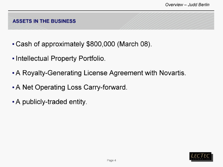 | ASSETS IN THE BUSINESS Cash of approximately $800,000 (March 08). Intellectual Property Portfolio. A Royalty-Generating License Agreement with Novartis. A Net Operating Loss Carry-forward. A publicly-traded entity. Overview - Judd Berlin |