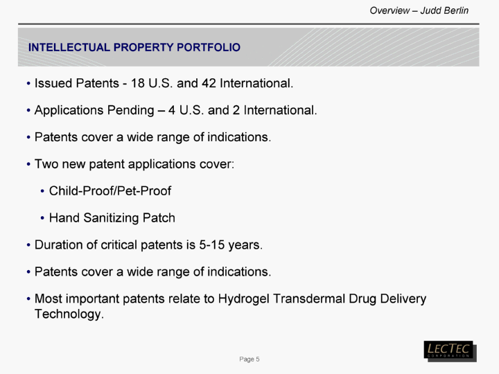| INTELLECTUAL PROPERTY PORTFOLIO Issued Patents - 18 U.S. and 42 International. Applications Pending - 4 U.S. and 2 International. Patents cover a wide range of indications. Two new patent applications cover: Child-Proof/Pet-Proof Hand Sanitizing Patch Duration of critical patents is 5-15 years. Patents cover a wide range of indications. Most important patents relate to Hydrogel Transdermal Drug Delivery Technology. Overview - Judd Berlin |