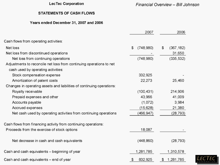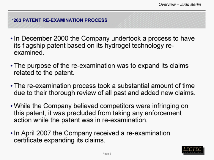 | '263 PATENT RE-EXAMINATION PROCESS In December 2000 the Company undertook a process to have its flagship patent based on its hydrogel technology re- examined. The purpose of the re-examination was to expand its claims related to the patent. The re-examination process took a substantial amount of time due to their thorough review of all past and added new claims. While the Company believed competitors were infringing on this patent, it was precluded from taking any enforcement action while the patent was in re-examination. In April 2007 the Company received a re-examination certificate expanding its claims. Overview - Judd Berlin |