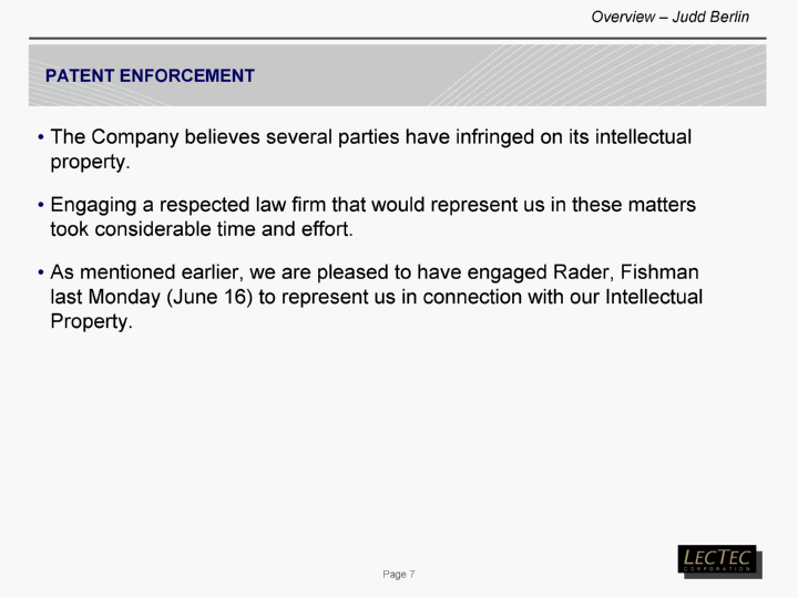 | PATENT ENFORCEMENT The Company believes several parties have infringed on its intellectual property. Engaging a respected law firm that would represent us in these matters took considerable time and effort. As mentioned earlier, we are pleased to have engaged Rader, Fishman last Monday (June 16) to represent us in connection with our Intellectual Property. Overview - Judd Berlin |