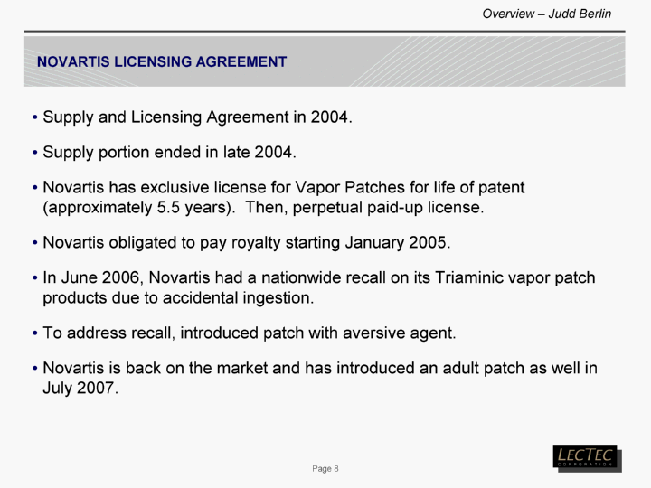 | NOVARTIS LICENSING AGREEMENT Supply and Licensing Agreement in 2004. Supply portion ended in late 2004. Novartis has exclusive license for Vapor Patches for life of patent (approximately 5.5 years). Then, perpetual paid-up license. Novartis obligated to pay royalty starting January 2005. In June 2006, Novartis had a nationwide recall on its Triaminic vapor patch products due to accidental ingestion. To address recall, introduced patch with aversive agent. Novartis is back on the market and has introduced an adult patch as well in July 2007. Overview - Judd Berlin |