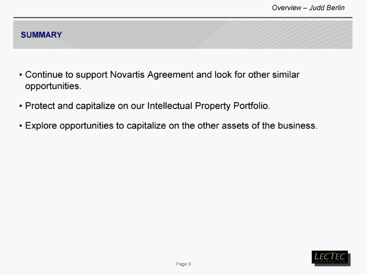 | SUMMARY Continue to support Novartis Agreement and look for other similar opportunities. Protect and capitalize on our Intellectual Property Portfolio. Explore opportunities to capitalize on the other assets of the business. Overview - Judd Berlin |