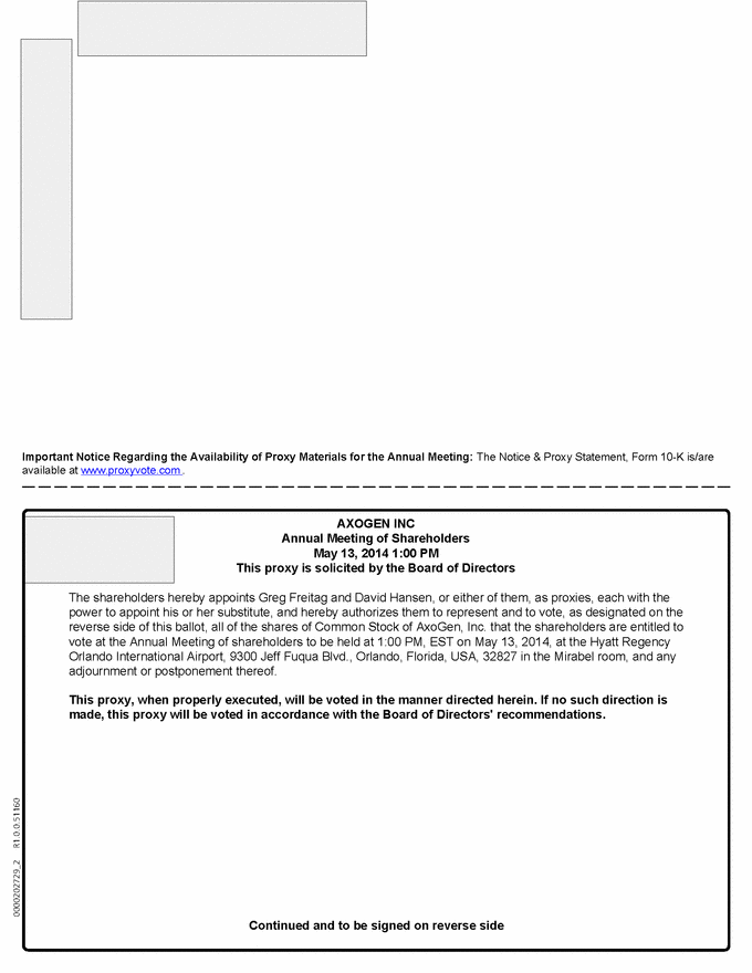 0000202729_2 R1.0.0.51160 Important Notice Regarding the Availability of Proxy Materials for the Annual Meeting: The Notice & Proxy Statement, Form 10-K is/are available at www.proxyvote.com . AXOGEN INC Annual Meeting of Shareholders May 13, 2014 1:00 PM This proxy is solicited by the Board of Directors The shareholders hereby appoints Greg Freitag and David Hansen, or either of them, as proxies, each with the power to appoint his or her substitute, and hereby authorizes them to represent and to vote, as designated on the reverse side of this ballot, all of the shares of Common Stock of AxoGen, Inc. that the shareholders are entitled to vote at the Annual Meeting of shareholders to be held at 1:00 PM, EST on May 13, 2014, at the Hyatt Regency Orlando International Airport, 9300 Jeff Fuqua Blvd., Orlando, Florida, USA, 32827 in the Mirabel room, and any adjournment or postponement thereof. This proxy, when properly executed, will be voted in the manner directed herein. If no such direction is made, this proxy will be voted in accordance with the Board of Directors' recommendations. Continued and to be signed on reverse side |