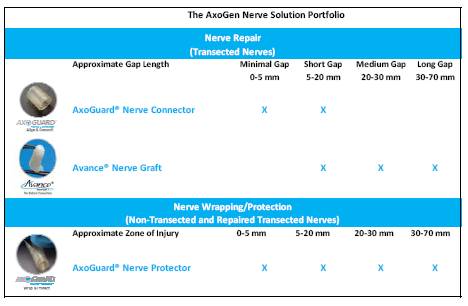 In order to improve the options available for the surgical repair and regeneration of peripheral nerves, AxoGen has developed and licensed regenerative medicine technologies. AxoGens innovative approach to regenerative medicine has resulted in first-in-class products that it believes are redefining the peripheral nerve repair market. AxoGens products offer a full suite of surgical nerve repair solutions including Avance® Nerve Graft, a proprietary off-the-shelf processed nerve allograft (human nerve tissue obtained from a donor) used for bridging severed nerves without the comorbidities associated with a nerve autograft additional surgical site, such as loss of feeling where the nerve was removed and potential pain at the donor site. The Companys AxoGuard® line of products is made of porcine submucosa extracellular matrix, or ECM. AxoGuard® Nerve Connector is a coaptation aid to facilitate the tensionless repair of severed nerves, and AxoGuard® Nerve Protector is used to wrap and protect injured peripheral nerves and reinforce the nerve reconstruction while preventing soft tissue attachments.