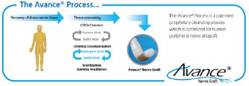 Avance® Nerve Graft is intended for the surgical repair of peripheral nerve discontinuities to support regeneration across the defect (a gap created when the nerve is severed). It is intended to act as a bridge in order to guide and structurally support axonal regeneration across a nerve gap caused by traumatic injury or surgical intervention. Avance® Nerve Graft is decellularized and sterile extracellular matrix (ECM) processed from human peripheral nerve tissue. AxoGen developed the Avance® Nerve Graft by following the guiding principle that the human body created the optimal nerve structure. AxoGen, through its licensing efforts and research, developed the Avance® process, a proprietary method for processing recovered human peripheral nerve tissue in a manner that preserves the essential structure of the ECM while cleansing away cellular and noncellular debris. Avance® Nerve Graft provides the natural nerve structure of an autograft and the ease and availability of an off-the-shelf product. AxoGen believes that Avance® Nerve Graft is the first off-the-shelf human nerve allograft for bridging nerve discontinuities. Avance® Nerve Graft is comprised of bundles of small diameter endoneurial tubes that are held together by an outer sheath called the epineurium. Avance® Nerve Graft has been processed to remove cellular and noncellular factors such as cells, fat, blood, axonal debris and chondroitin sulfate proteoglycans, (CSPG), while preserving the three-dimensional laminin lined tubular bioscaffold (i.e. microarchitecture), epineurium and microvasculature of the peripheral nerve. After processing, Avance® Nerve Graft is flexible and pliable, and its epineurium can be sutured in place allowing for tension-free approximation of the proximal and distal peripheral nerve stumps. The design results in a product that has clean and clear pathways for the regenerating axons to grow through. During the healing process, the body revascularizes and gradually remodels the graft into the patients own tissue while allowing the processed nerve allograft to physically support axonal regeneration across the nerve discontinuity.