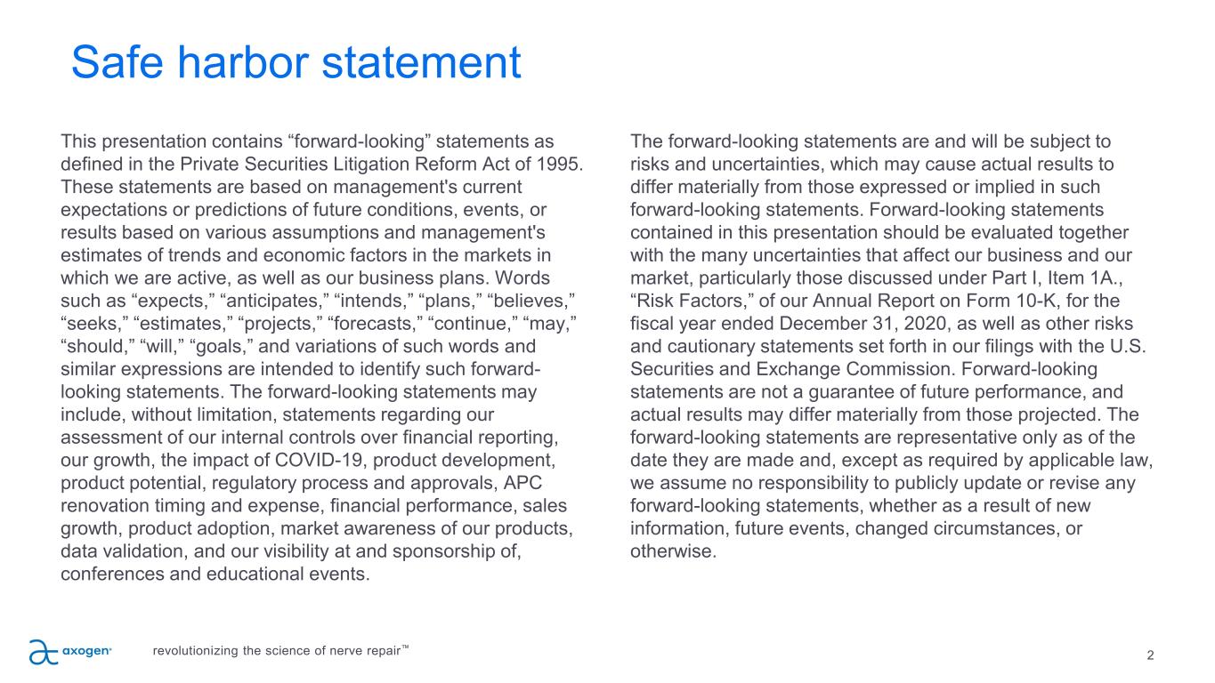 2 This presentation contains “forward-looking” statements as defined in the Private Securities Litigation Reform Act of 1995. These statements are based on management's current expectations or predictions of future conditions, events, or results based on various assumptions and management's estimates of trends and economic factors in the markets in which we are active, as well as our business plans. Words such as “expects,” “anticipates,” “intends,” “plans,” “believes,” “seeks,” “estimates,” “projects,” “forecasts,” “continue,” “may,” “should,” “will,” “goals,” and variations of such words and similar expressions are intended to identify such forward- looking statements. The forward-looking statements may include, without limitation, statements regarding our assessment of our internal controls over financial reporting, our growth, the impact of COVID-19, product development, product potential, regulatory process and approvals, APC renovation timing and expense, financial performance, sales growth, product adoption, market awareness of our products, data validation, and our visibility at and sponsorship of, conferences and educational events. The forward-looking statements are and will be subject to risks and uncertainties, which may cause actual results to differ materially from those expressed or implied in such forward-looking statements. Forward-looking statements contained in this presentation should be evaluated together with the many uncertainties that affect our business and our market, particularly those discussed under Part I, Item 1A., “Risk Factors,” of our Annual Report on Form 10-K, for the fiscal year ended December 31, 2020, as well as other risks and cautionary statements set forth in our filings with the U.S. Securities and Exchange Commission. Forward-looking statements are not a guarantee of future performance, and actual results may differ materially from those projected. The forward-looking statements are representative only as of the date they are made and, except as required by applicable law, we assume no responsibility to publicly update or revise any forward-looking statements, whether as a result of new information, future events, changed circumstances, or otherwise. Safe harbor statement revolutionizing the science of nerve repair™
