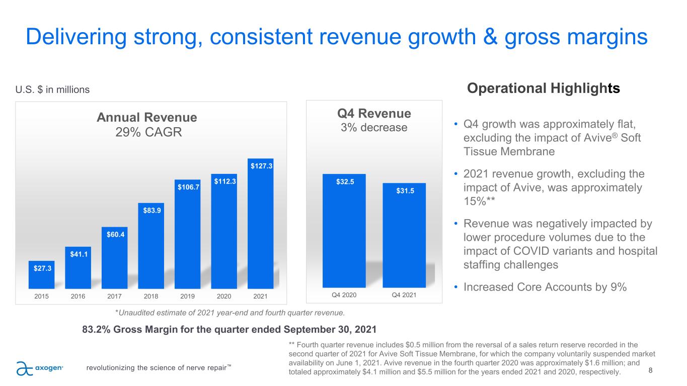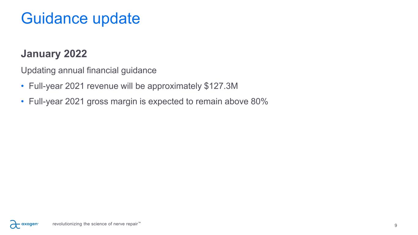 Guidance update 9 January 2022 Updating annual financial guidance • Full-year 2021 revenue will be approximately $127.3M • Full-year 2021 gross margin is expected to remain above 80% revolutionizing the science of nerve repair™