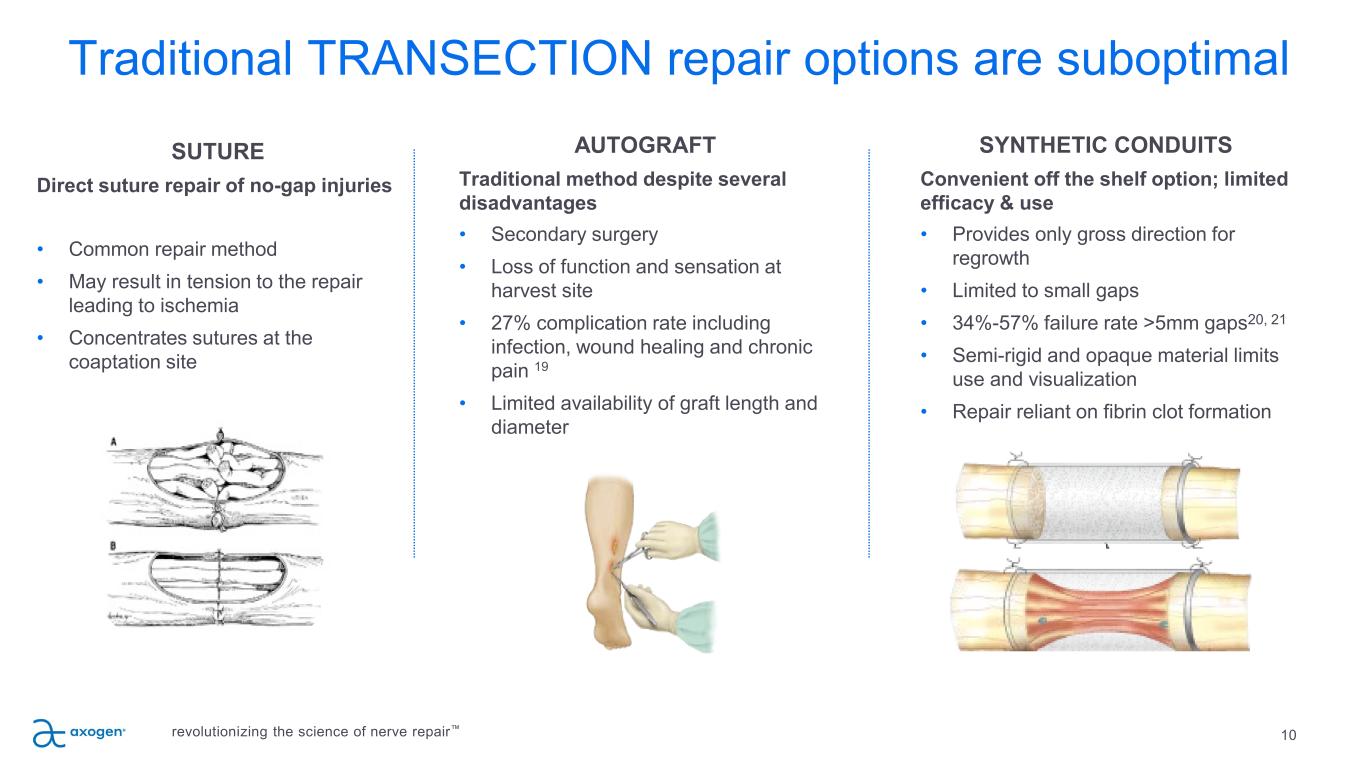 Traditional TRANSECTION repair options are suboptimal 10 SUTURE Direct suture repair of no-gap injuries • Common repair method • May result in tension to the repair leading to ischemia • Concentrates sutures at the coaptation site AUTOGRAFT Traditional method despite several disadvantages • Secondary surgery • Loss of function and sensation at harvest site • 27% complication rate including infection, wound healing and chronic pain 19 • Limited availability of graft length and diameter SYNTHETIC CONDUITS Convenient off the shelf option; limited efficacy & use • Provides only gross direction for regrowth • Limited to small gaps • 34%-57% failure rate >5mm gaps20, 21 • Semi-rigid and opaque material limits use and visualization • Repair reliant on fibrin clot formation revolutionizing the science of nerve repair™