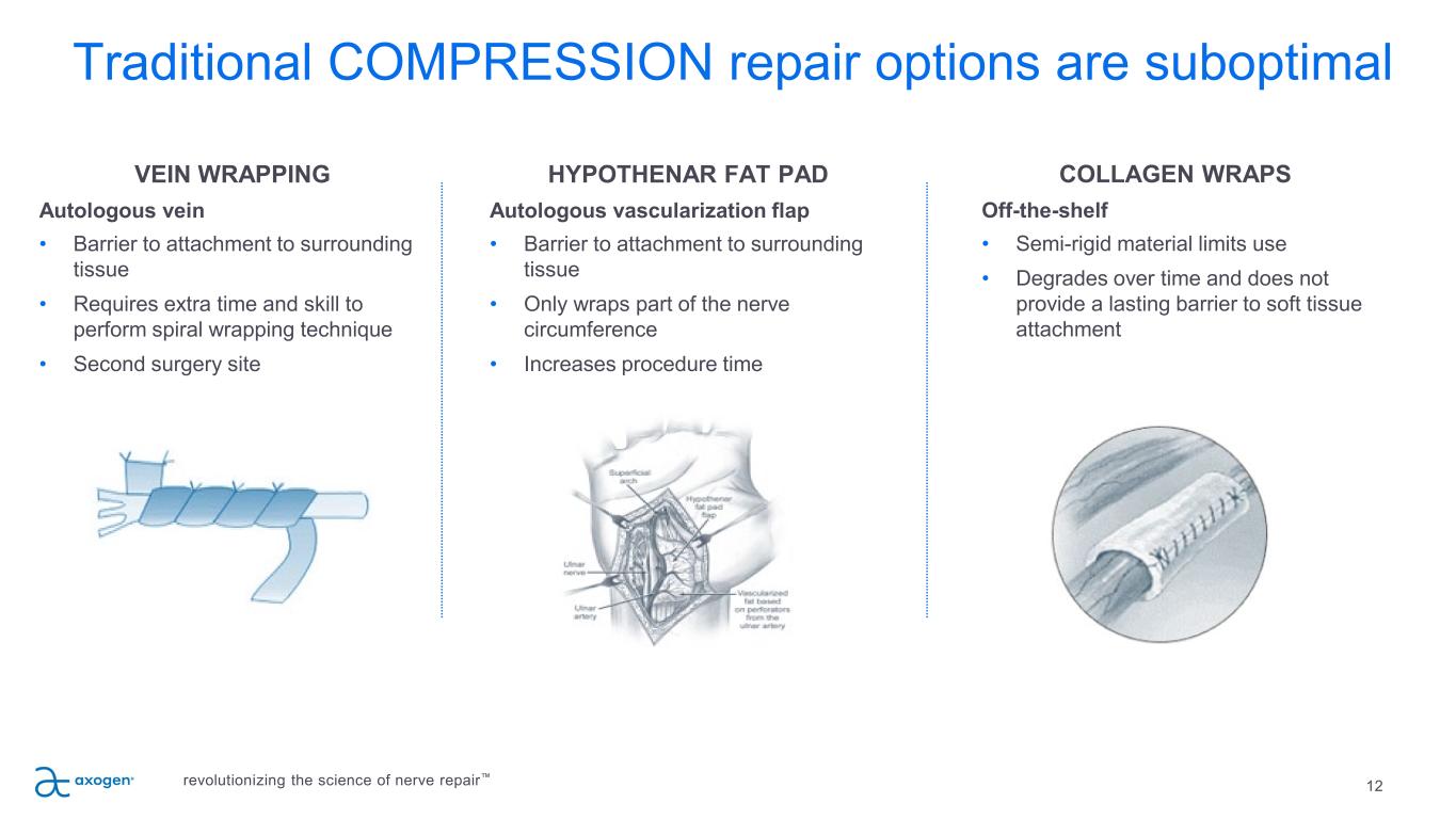 11 25 µm Processed human nerve allograft for bridging nerve gaps Clinically studied off-the-shelf alternative • A biologically active nerve therapy with more than ten years of comprehensive clinical evidence • 82-84% meaningful recovery in sensory, mixed and motor nerve gaps in multi-center study22 • Eliminates need for an additional surgical site and risks of donor nerve harvest22 • May reduce OR time Structural support for regenerating axons • Cleansed and decellularized extracellular matrix (ECM) • Offers the benefits of human peripheral nerve micro-architecture and handling Revascularizes and remodels into patient’s own tissue similar to autologous nerve23 16 size options in a variety of lengths (up to 70mm) and diameters (up to 5mm) Only minimally processed porcine ECM for connector-assisted coaptation Alternative to direct suture repair • Reduces the risk of forced fascicular mismatch24, 25 Alleviates tension at critical zone of regeneration • Disperses tension across repair site26 • Moves suture inflammation away from coaptation face27, 28 Remodels into vascularized patient tissue28, 29, 30, 31, 32 Axogen solutions for TRANSECTION repair revolutionizing the science of nerve repair™