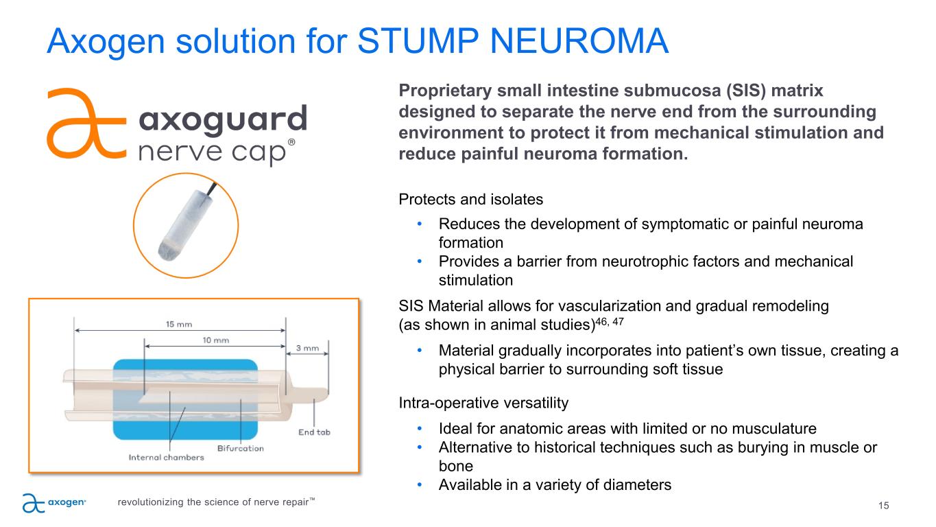 Traditional STUMP NEUROMA options are suboptimal 14 TRACTION NEURECTOMY Nerve placed in traction and cut to allow for retraction • Simply resecting the nerve results in subsequent neuroma formation and risk of secondary surgery • Causes traction injury • High risk of recurrence36 BURYING IN MUSCLE/BONE Traditional method of neurectomy and neuromyodesis • Simply resecting the nerve results in subsequent neuroma formation and risk of secondary surgery • Pain due to muscular contraction or localized pressure • Larger surgical dissection • Only 33-40% of patients were satisfied with treatment after burial into bone or muscle37, 38, 39 INJECTIONS Pharmacologic intervention, typically alcohol or steroids40, 41, 42, 43, 44, 45 • Chemical injections are only successful 40% of the time 43, 44 • Temporary solution that has a reduced benefit over time • May cause considerable side effects revolutionizing the science of nerve repair™