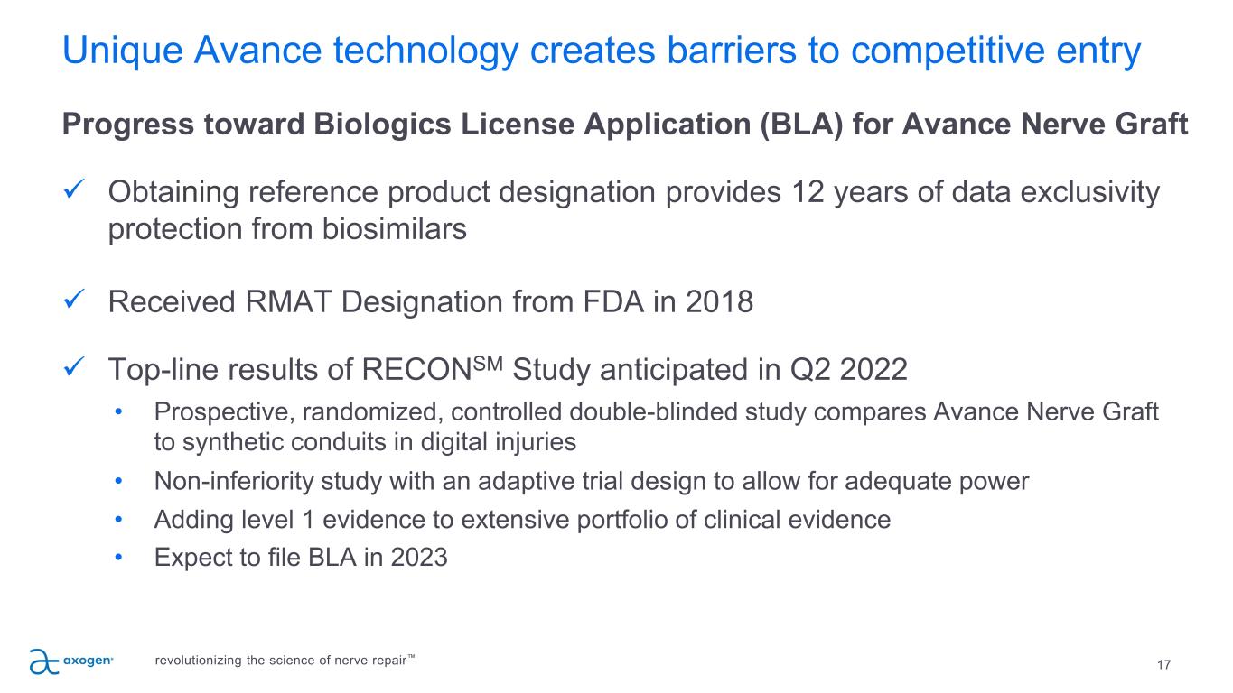 16 Avance IP and regulatory barriers to competitive entry Avance nerve graft is processed and distributed in accordance with US FDA requirements for Human Cellular and Tissue-based Products (HCT/P) Avance nerve graft Issued U.S. Patents 6,696,575 9,597,429 6,972,168 9,690,975 7,402,319 9,996,729 7,732,200 10,311,281 7,851,447 10,441,681 8,758,794 10,783,349 8,986,733 10,813,643 9,402,868 11,156,595 9,572,911 11,147,558 Axogen has Enforcement Discretion from FDA allowing continued sales under controls applicable to HCT/Ps with agreed transition plan to regulation as a Biological Product under a Biologic License Application (BLA) if approved. A new (non-biosimilar) competitive processed nerve allograft, we believe, would need to complete clinical testing and obtain BLA approval prior to clinical release. Avance expected to be the reference product for the category of processed nerve allograft Avance nerve graft IP protection to 2023 and beyond New (non-biosimilar) competitive BLA product estimated 8 years Protection from potential biosimilars –12 years data exclusivity from BLA approval revolutionizing the science of nerve repair™