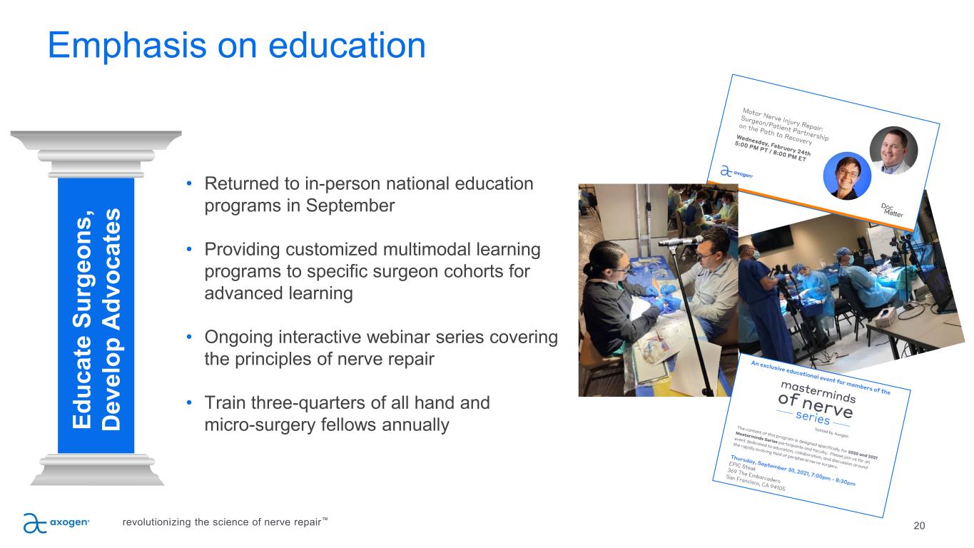 19 Focus on building awareness among clinicians and patients • Increasing omnichannel engagement with clinicians and patients • Continuing clinical conference participation both virtually and in person as appropriate • Ongoing patient ambassador program • Garnering positive media attention • Growing social media presenceB ui ld M ar ke t A w ar en es s revolutionizing the science of nerve repair™