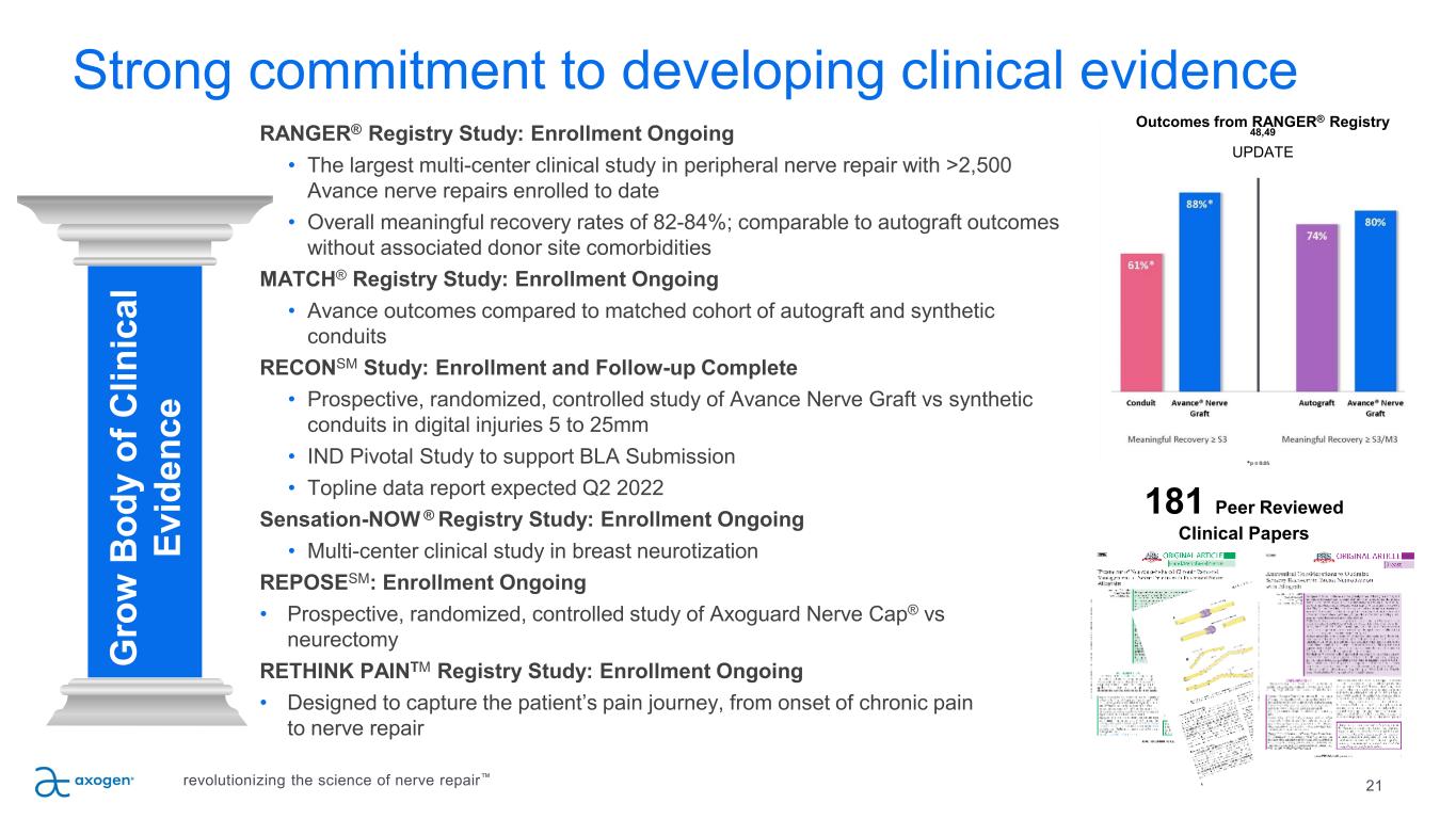 20 P IL L A R 2 Emphasis on education • Returned to in-person national education programs in September • Providing customized multimodal learning programs to specific surgeon cohorts for advanced learning • Ongoing interactive webinar series covering the principles of nerve repair • Train three-quarters of all hand and micro-surgery fellows annuallyEd uc at e Su rg eo ns , D ev el op A dv oc at es revolutionizing the science of nerve repair™