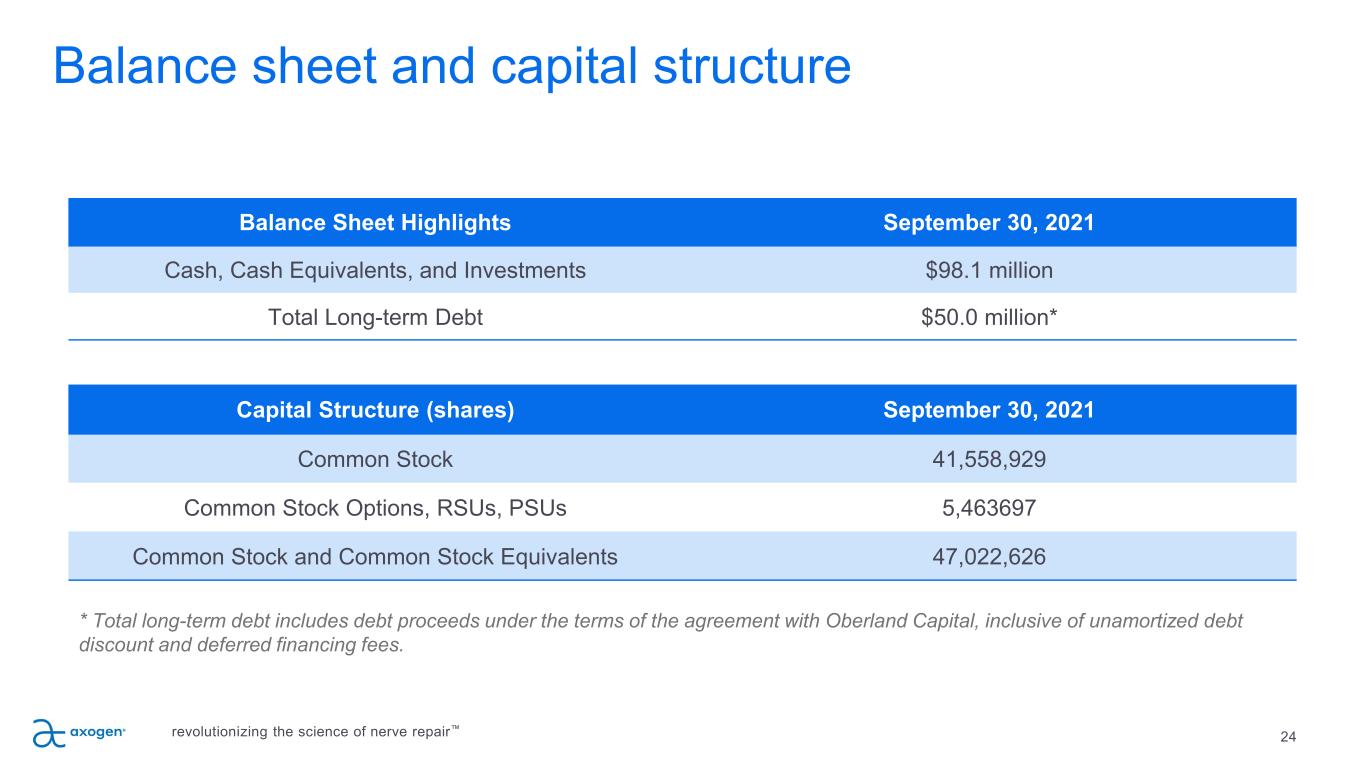 23 P IL L A R 5 Expand the opportunity in nerve repair P IL L A R 4 P IL L A R 3 Ex pa nd P ro du ct Pi pe lin e & A pp lic at io ns Breast Neurotization Loss of breast sensation affects QOL Urology Prostatectomy OMF Iatrogenic nerve injuries, mandible tumor resections affects eating, speaking, intimacy Extremities (Trauma and Compression) Acute trauma, revision carpal tunnel and cubital tunnel Head & Neck OB/GYN General Surgery Cardio Thoracic Orthopedic Podiatry Vascular Pain Iatrogenic injuries, post-traumatic, migraine, joint pain, amputations, symptomatic neuromas, and nerve compressions Ophthalmology Expanding Core Business: Market Expansion & Development; Product Pipeline; International revolutionizing the science of nerve repair™