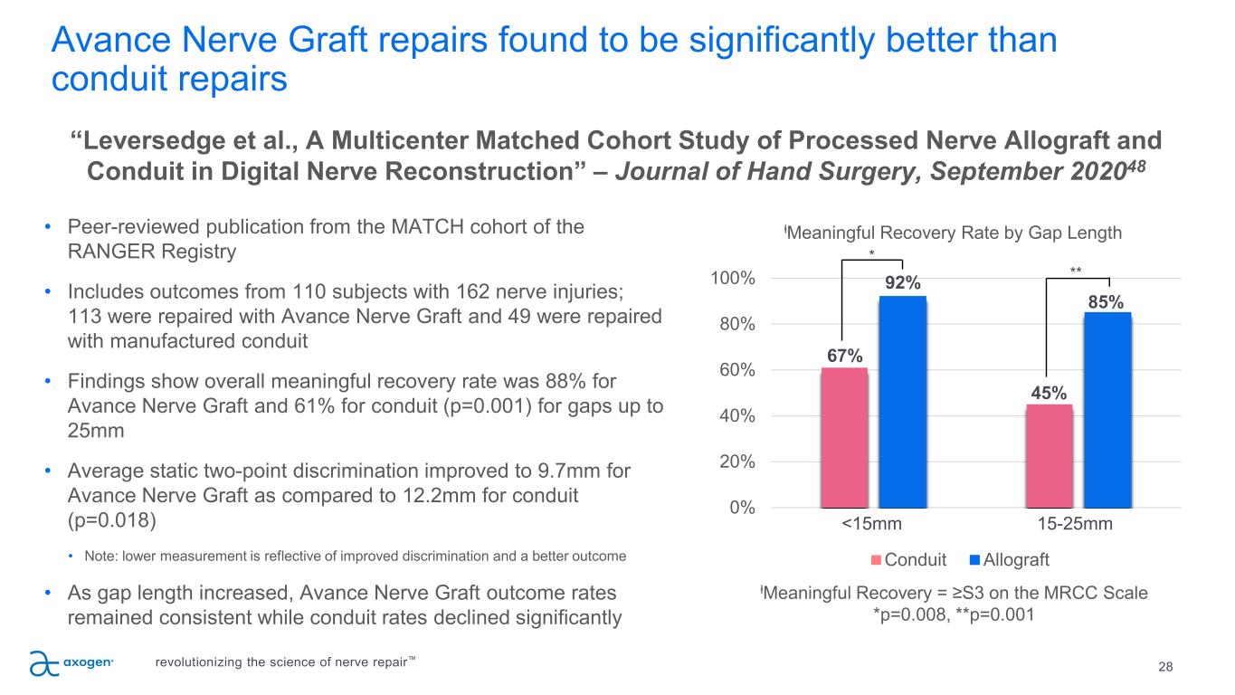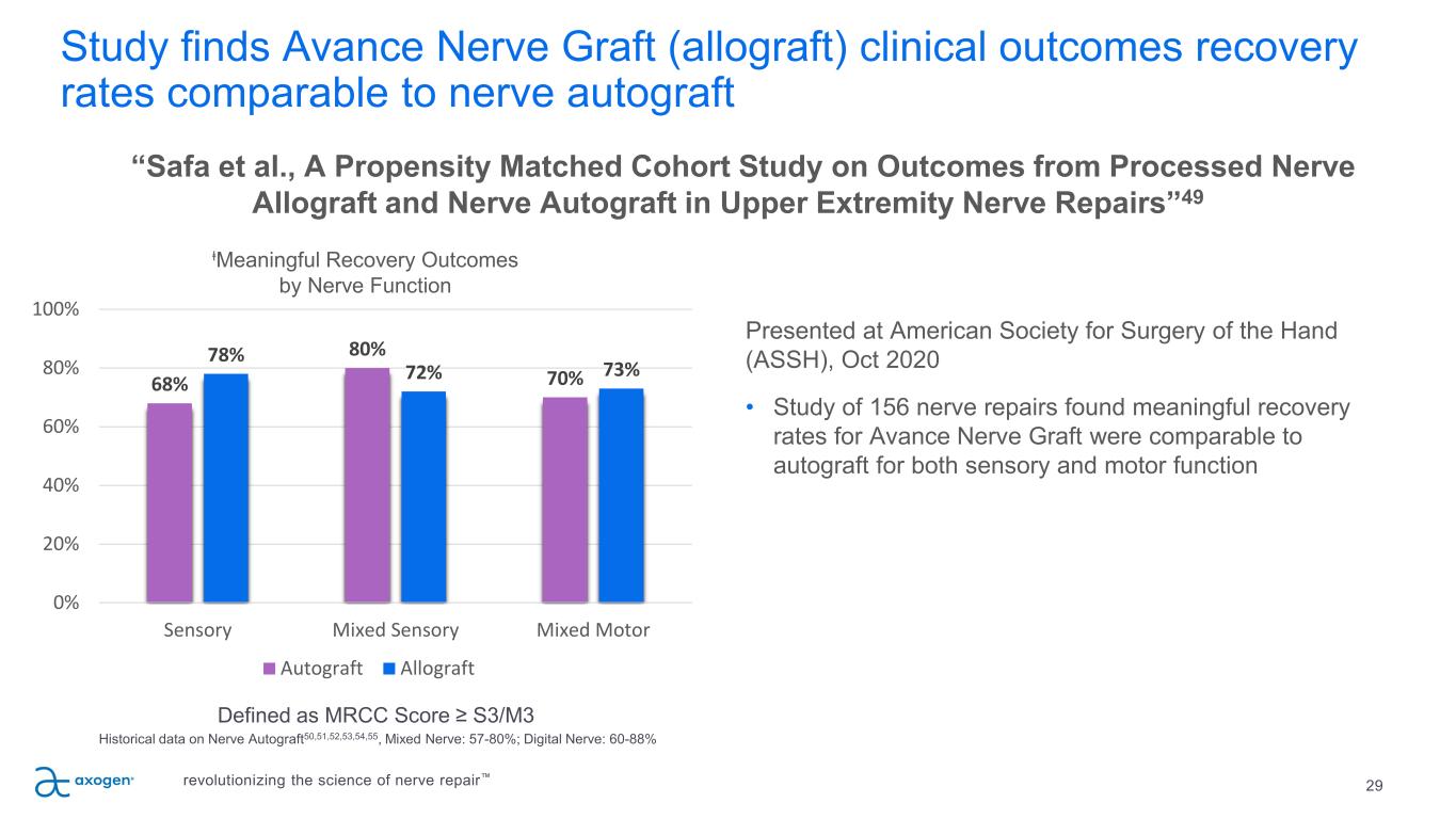 Avance Nerve Graft repairs found to be significantly better than conduit repairs 28 • Peer-reviewed publication from the MATCH cohort of the RANGER Registry • Includes outcomes from 110 subjects with 162 nerve injuries; 113 were repaired with Avance Nerve Graft and 49 were repaired with manufactured conduit • Findings show overall meaningful recovery rate was 88% for Avance Nerve Graft and 61% for conduit (p=0.001) for gaps up to 25mm • Average static two-point discrimination improved to 9.7mm for Avance Nerve Graft as compared to 12.2mm for conduit (p=0.018) • Note: lower measurement is reflective of improved discrimination and a better outcome • As gap length increased, Avance Nerve Graft outcome rates remained consistent while conduit rates declined significantly “Leversedge et al., A Multicenter Matched Cohort Study of Processed Nerve Allograft and Conduit in Digital Nerve Reconstruction” – Journal of Hand Surgery, September 202048 0% 20% 40% 60% 80% 100% ⱡMeaningful Recovery Rate by Gap Length Conduit Allograft <15mm 15-25mm ⱡMeaningful Recovery = ≥S3 on the MRCC Scale *p=0.008, **p=0.001 67% 92% 45% 85% * ** revolutionizing the science of nerve repair™