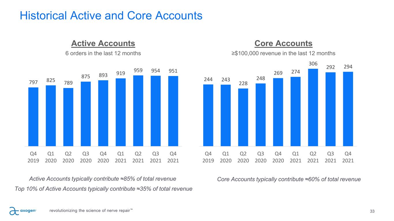 Historical Active and Core Accounts Active Accounts typically contribute ≈85% of total revenue Top 10% of Active Accounts typically contribute ≈35% of total revenue Active Accounts 6 orders in the last 12 months Core Accounts typically contribute ≈60% of total revenue Core Accounts ≥$100,000 revenue in the last 12 months 797 825 789 875 893 919 959 954 951 Q4 2019 Q1 2020 Q2 2020 Q3 2020 Q4 2020 Q1 2021 Q2 2021 Q3 2021 Q4 2021 244 243 228 248 269 274 306 292 294 Q4 2019 Q1 2020 Q2 2020 Q3 2020 Q4 2020 Q1 2021 Q2 2021 Q3 2021 Q4 2021 33revolutionizing the science of nerve repair™