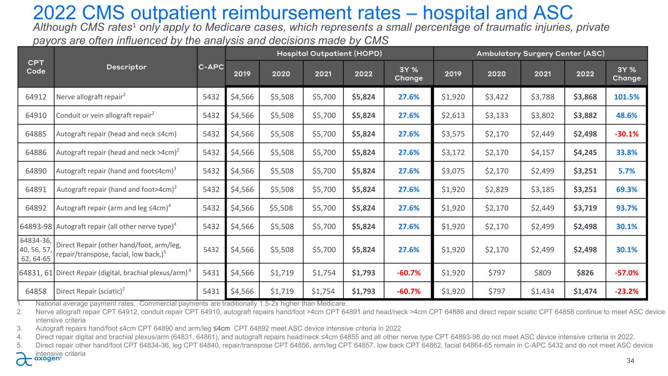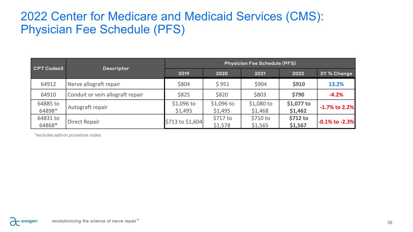 CPT Code Descriptor C-APC Hospital Outpatient (HOPD) Ambulatory Surgery Center (ASC) 2019 2020 2021 2022 3Y % Change 2019 2020 2021 2022 3Y % Change 64912 Nerve allograft repair2 5432 $4,566 $5,508 $5,700 $5,824 27.6% $1,920 $3,422 $3,788 $3,868 101.5% 64910 Conduit or vein allograft repair2 5432 $4,566 $5,508 $5,700 $5,824 27.6% $2,613 $3,133 $3,802 $3,882 48.6% 64885 Autograft repair (head and neck ≤4cm) 5432 $4,566 $5,508 $5,700 $5,824 27.6% $3,575 $2,170 $2,449 $2,498 -30.1% 64886 Autograft repair (head and neck >4cm)2 5432 $4,566 $5,508 $5,700 $5,824 27.6% $3,172 $2,170 $4,157 $4,245 33.8% 64890 Autograft repair (hand and foot≤4cm)3 5432 $4,566 $5,508 $5,700 $5,824 27.6% $3,075 $2,170 $2,499 $3,251 5.7% 64891 Autograft repair (hand and foot>4cm)2 5432 $4,566 $5,508 $5,700 $5,824 27.6% $1,920 $2,829 $3,185 $3,251 69.3% 64892 Autograft repair (arm and leg ≤4cm)4 5432 $4,566 $5,508 $5,700 $5,824 27.6% $1,920 $2,170 $2,449 $3,719 93.7% 64893-98 Autograft repair (all other nerve type)4 5432 $4,566 $5,508 $5,700 $5,824 27.6% $1,920 $2,170 $2,499 $2,498 30.1% 64834-36, 40, 56, 57, 62, 64-65 Direct Repair (other hand/foot, arm/leg, repair/transpose, facial, low back,)5 5432 $4,566 $5,508 $5,700 $5,824 27.6% $1,920 $2,170 $2,499 $2,498 30.1% 64831, 61 Direct Repair (digital, brachial plexus/arm) 4 5431 $4,566 $1,719 $1,754 $1,793 -60.7% $1,920 $797 $809 $826 -57.0% 64858 Direct Repair (sciatic)2 5431 $4,566 $1,719 $1,754 $1,793 -60.7% $1,920 $797 $1,434 $1,474 -23.2% 2022 CMS outpatient reimbursement rates – hospital and ASC 34 Although CMS rates1 only apply to Medicare cases, which represents a small percentage of traumatic injuries, private payors are often influenced by the analysis and decisions made by CMS 1. National average payment rates. Commercial payments are traditionally 1.5-2x higher than Medicare. 2. Nerve allograft repair CPT 64912, conduit repair CPT 64910, autograft repairs hand/foot >4cm CPT 64891 and head/neck >4cm CPT 64886 and direct repair sciatic CPT 64858 continue to meet ASC device intensive criteria 3. Autograft repairs hand/foot ≤4cm CPT 64890 and arm/leg ≤4cm CPT 64892 meet ASC device intensive criteria in 2022 4. Direct repair digital and brachial plexus/arm (64831, 64861), and autograft repairs head/neck ≤4cm 64855 and all other nerve type CPT 64893-98 do not meet ASC device intensive criteria in 2022. 5. Direct repair other hand/foot CPT 64834-36, leg CPT 64840, repair/transpose CPT 64856, arm/leg CPT 64857, low back CPT 64862, facial 64864-65 remain in C-APC 5432 and do not meet ASC device intensive criteria
