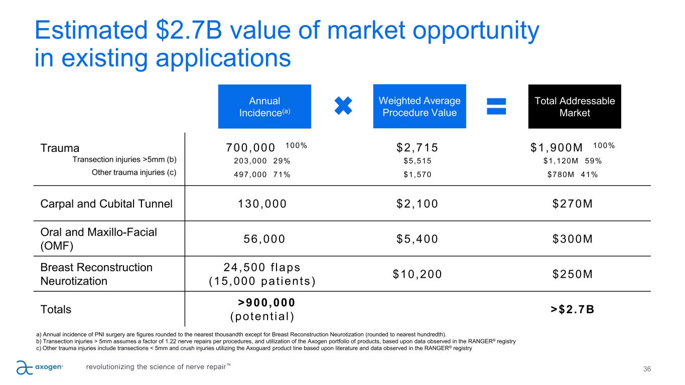 Annual Incidence(a) Weighted Average Procedure Value Total Addressable Market Trauma Transection injuries >5mm (b) Other trauma injuries (c) 700,000 100% 203,000 29% 497,000 71% $2,715 $5,515 $1,570 $1,900M 100% $1,120M 59% $780M 41% Carpal and Cubital Tunnel 130,000 $2,100 $270M Oral and Maxillo-Facial (OMF) 56,000 $5,400 $300M Breast Reconstruction Neurotization 24,500 f laps (15,000 pat ients ) $10,200 $250M Totals >900,000 (potent ia l ) >$2.7B a) Annual incidence of PNI surgery are figures rounded to the nearest thousandth except for Breast Reconstruction Neurotization (rounded to nearest hundredth). b) Transection injuries > 5mm assumes a factor of 1.22 nerve repairs per procedures, and utilization of the Axogen portfolio of products, based upon data observed in the RANGER® registry c) Other trauma injuries include transections < 5mm and crush injuries utilizing the Axoguard product line based upon literature and data observed in the RANGER® registry 36 Estimated $2.7B value of market opportunity in existing applications revolutionizing the science of nerve repair™