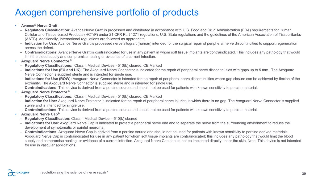 Axogen comprehensive portfolio of products • Avance® Nerve Graft – Regulatory Classification: Avance Nerve Graft is processed and distributed in accordance with U.S. Food and Drug Administration (FDA) requirements for Human Cellular and Tissue-based Products (HCT/P) under 21 CFR Part 1271 regulations, U.S. State regulations and the guidelines of the American Association of Tissue Banks (AATB). Additionally, international regulations are followed as appropriate. – Indication for Use: Avance Nerve Graft is processed nerve allograft (human) intended for the surgical repair of peripheral nerve discontinuities to support regeneration across the defect. – Contraindications: Avance Nerve Graft is contraindicated for use in any patient in whom soft tissue implants are contraindicated. This includes any pathology that would limit the blood supply and compromise healing or evidence of a current infection. • Axoguard Nerve Connector ® – Regulatory Classifications: Class II Medical Devices - 510(k) cleared, CE Marked – Indications for Use (EU and UK): The Axoguard Nerve Connector is indicated for the repair of peripheral nerve discontinuities with gaps up to 5 mm. The Axoguard Nerve Connector is supplied sterile and is intended for single use. – Indications for Use (ROW): Axoguard Nerve Connector is intended for the repair of peripheral nerve discontinuities where gap closure can be achieved by flexion of the extremity. The Axoguard Nerve Connector is supplied sterile and is intended for single use. – Contraindications: This device is derived from a porcine source and should not be used for patients with known sensitivity to porcine material. • Axoguard Nerve Protector ® – Regulatory Classifications: Class II Medical Devices - 510(k) cleared, CE Marked – Indication for Use: Axoguard Nerve Protector is indicated for the repair of peripheral nerve injuries in which there is no gap. The Axoguard Nerve Connector is supplied sterile and is intended for single use. – Contraindications: This device is derived from a porcine source and should not be used for patients with known sensitivity to porcine material. • Axoguard Nerve Cap® – Regulatory Classification: Class II Medical Device – 510(k) cleared – Indications for Use: Axoguard Nerve Cap is indicated to protect a peripheral nerve end and to separate the nerve from the surrounding environment to reduce the development of symptomatic or painful neuroma. – Contraindications: Axoguard Nerve Cap is derived from a porcine source and should not be used for patients with known sensitivity to porcine derived materials. Axoguard Nerve Cap is contraindicated for use in any patient for whom soft tissue implants are contraindicated; this includes any pathology that would limit the blood supply and compromise healing, or evidence of a current infection. Axoguard Nerve Cap should not be implanted directly under the skin. Note: This device is not intended for use in vascular applications. 39revolutionizing the science of nerve repair™