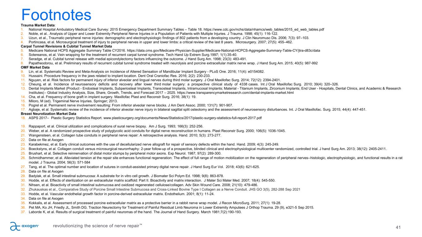 41 Footnotes Trauma Market Data: 1. National Hospital Ambulatory Medical Care Survey: 2015 Emergency Department Summary Tables – Table 18. https://www.cdc.gov/nchs/data/nhamcs/web_tables/2015_ed_web_tables.pdf 2. Noble, et al.. Analysis of Upper and Lower Extremity Peripheral Nerve Injuries in a Population of Patients with Multiple Injuries. J Trauma. 1998; 45(1): 116-122. 3. Uzun, et al., Traumatic peripheral nerve injuries: demographic and electrophysiologic findings of 802 patients from a developing country. J Clin Neuromusc Dis. 2006; 7(3): 97–103. 4. Portincasa, et al. Microsurgical treatment of injury to peripheral nerves in upper and lower limbs: a critical review of the last 8 years. Microsurgery. 2007; 27(5): 455–462. Carpal Tunnel Revisions & Cubital Tunnel Market Data 5. Medicare National HCPS Aggregate Summary Table CY2016. https://data.cms.gov/Medicare-Physician-Supplier/Medicare-National-HCPCS-Aggregate-Summary-Table-CY/jtra-d83c/data 6. Sotereanos, et al. Vein wrapping for the treatment of recurrent carpal tunnel syndrome. Tech Hand Up Extrem Surg.1997; 1(1):35-40. 7. Seradge, et al. Cubital tunnel release with medial epicondylectomy factors influencing the outcome. J Hand Surg Am. 1998; 23(3): 483-491. 8. Papatheodorou, et al. Preliminary results of recurrent cubital tunnel syndrome treated with neurolysis and porcine extracellular matrix nerve wrap. J Hand Surg Am. 2015; 40(5): 987-992 OMF Market Data 9. Lin, et al. Systematic Review and Meta-Analysis on Incidence of Altered Sensation of Mandibular Implant Surgery - PLoS One. 2016; 11(4): e0154082. 10. Hussaini. Procedure frequency in the jaws related to implant location. Dent Oral Craniofac Res. 2016; 2(2): 230-233. 11. Nguyen, et al. Risk factors for permanent injury of inferior alveolar and lingual nerves during third molar surgery. J Oral Maxillofac Surg. 2014; 72(12): 2394-2401. 12. Cheung, et al. Incidence of neurosensory deficits and recovery after lower third molar surgery: a prospective clinical study of 4338 cases. Int J Oral Maxillofac Surg. 2010; 39(4): 320–326. 13. Dental Implants Market (Product - Endosteal Implants, Subperiosteal Implants, Transosteal Implants, Intramucosal Implants; Material - Titanium Implants, Zirconium Implants; End User - Hospitals, Dental Clinics, and Academic & Research Institutes) - Global Industry Analysis, Size, Share, Growth, Trends, and Forecast 2017 – 2025. https://www.transparencymarketresearch.com/dental-implants-market.html 14. Cha, et al. Frequency of bone graft in implant surgery. Maxillofac Plast and Reconstr Surg. 2016; 38(1): 19. 15. Miloro, M (ed). Trigeminal Nerve Injuries. Springer; 2013. 16. Pogrel et al. Permanent nerve involvement resulting: From inferior alveolar nerve blocks. J Am Dent Assoc. 2000; 131(7): 901-907. 17. Agbaje, et al. Systematic review of the incidence of inferior alveolar nerve injury in bilateral sagittal split osteotomy and the assessment of neurosensory disturbances. Int. J Oral Maxillofac. Surg. 2015; 44(4): 447-451. Breast Neurotization Market Data 18. ASPS 2017– Plastic Surgery Statistics Report. www.plasticsurgery.org/documents/News/Statistics/2017/plastic-surgery-statistics-full-report-2017.pdf 19. Rappaport, et al. Clinical utilization and complications of sural nerve biopsy. Am J Surg. 1993; 166(3): 252-256. 20. Weber, et al. A randomized prospective study of polyglycolic acid conduits for digital nerve reconstruction in humans. Plast Reconstr Surg. 2000; 106(5): 1036-1045. 21. Wangensteen, et al. Collagen tube conduits in peripheral nerve repair: A retrospective analysis. Hand. 2010; 5(3): 273-277. 22. Data on file at Axogen 23. Karabekmez, et al. Early clinical outcomes with the use of decellularized nerve allograft for repair of sensory defects within the hand. Hand. 2009; 4(3): 245-249. 24. Boeckstyns, et al. Collagen conduit versus microsurgical neurorrhaphy: 2-year follow-up of a prospective, blinded clinical and electrophysiological multicenter randomized, controlled trial. J hand Surg Am. 2013; 38(12): 2405-2411. 25. Brushart, et al. Selective reinnervation of distal motor stumps by peripheral motor axons. Exp Neurol. 1987; 97(2): 289-300. 26. Schmidhammer, et al. Alleviated tension at the repair site enhances functional regeneration: The effect of full range of motion mobilization on the regeneration of peripheral nerves--histologic, electrophysiologic, and functional results in a rat model. J Trauma. 2004; 56(3): 571-584 27. Tang, et al. The optimal number and location of sutures in conduit-assisted primary digital nerve repair. J Hand Surg Eur Vol. 2018; 43(6): 621-625. 28. Data on file at Axogen 29. Badylak, et al. Small intestinal submucosa: A substrate for in vitro cell growth. J Biomater Sci Polym Ed. 1998; 9(8): 863-878. 30. Hodde, et al. Effects of sterilization on an extracellular matrix scaffold: Part II. Bioactivity and matrix interaction. J Mater Sci Mater Med. 2007; 18(4): 545-550. 31. Nihsen, et al. Bioactivity of small intestinal submucosa and oxidized regenerated cellulose/collagen. Adv Skin Wound Care. 2008; 21(10): 479-486. 32. Zhukauskas et al., Comparative Study of Porcine Small Intestine Submucosa and Cross-Linked Bovine Type I Collagen as a Nerve Conduit. JHS GO 3(5), 282-288 Sep 2021 33. Hodde, et al. Vascular endothelial growth factor in porcine-derived extracellular matrix. Endothelium. 2001; 8(1): 11-24. 34. Data on file at Axogen 35. Kokkalis, et al. Assessment of processed porcine extracellular matrix as a protective barrier in a rabbit nerve wrap model. J Recon MicroSurg. 2011; 27(1): 19-28. 36. Pet MA, Ko JH, Friedly JL, Smith DG. Traction Neurectomy for Treatment of Painful Residual Limb Neuroma in Lower Extremity Amputees J Orthop Trauma. 29 (9), e321-5 Sep 2015. 37. Laborde K, et al. Results of surgical treatment of painful neuromas of the hand. The Journal of Hand Surgery. March 1981;7(2):190-193. revolutionizing the science of nerve repair™