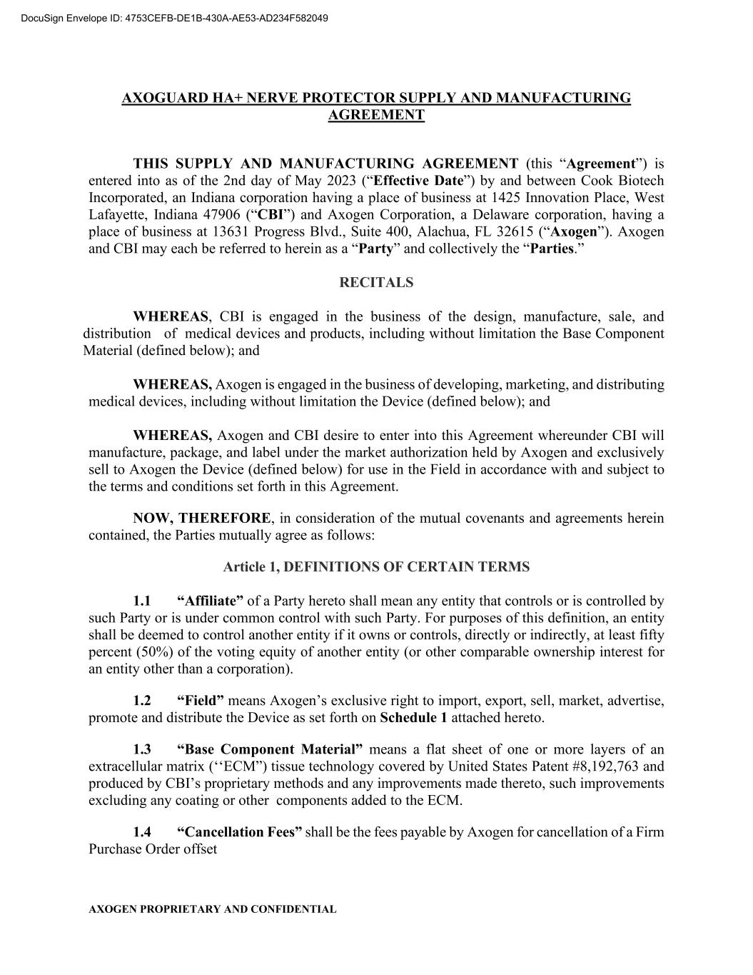 AXOGEN PROPRIETARY AND CONFIDENTIAL AXOGUARD HA+ NERVE PROTECTOR SUPPLY AND MANUFACTURING AGREEMENT THIS SUPPLY AND MANUFACTURING AGREEMENT (this “Agreement”) is entered into as of the 2nd day of May 2023 (“Effective Date”) by and between Cook Biotech Incorporated, an Indiana corporation having a place of business at 1425 Innovation Place, West Lafayette, Indiana 47906 (“CBI”) and Axogen Corporation, a Delaware corporation, having a place of business at 13631 Progress Blvd., Suite 400, Alachua, FL 32615 (“Axogen”). Axogen and CBI may each be referred to herein as a “Party” and collectively the “Parties.” RECITALS WHEREAS, CBI is engaged in the business of the design, manufacture, sale, and distribution of medical devices and products, including without limitation the Base Component Material (defined below); and WHEREAS, Axogen is engaged in the business of developing, marketing, and distributing medical devices, including without limitation the Device (defined below); and WHEREAS, Axogen and CBI desire to enter into this Agreement whereunder CBI will manufacture, package, and label under the market authorization held by Axogen and exclusively sell to Axogen the Device (defined below) for use in the Field in accordance with and subject to the terms and conditions set forth in this Agreement. NOW, THEREFORE, in consideration of the mutual covenants and agreements herein contained, the Parties mutually agree as follows: Article 1, DEFINITIONS OF CERTAIN TERMS 1.1 “Affiliate” of a Party hereto shall mean any entity that controls or is controlled by such Party or is under common control with such Party. For purposes of this definition, an entity shall be deemed to control another entity if it owns or controls, directly or indirectly, at least fifty percent (50%) of the voting equity of another entity (or other comparable ownership interest for an entity other than a corporation). 1.2 “Field” means Axogen’s exclusive right to import, export, sell, market, advertise, promote and distribute the Device as set forth on Schedule 1 attached hereto. 1.3 “Base Component Material” means a flat sheet of one or more layers of an extracellular matrix (‘‘ECM”) tissue technology covered by United States Patent #8,192,763 and produced by CBI’s proprietary methods and any improvements made thereto, such improvements excluding any coating or other components added to the ECM. 1.4 “Cancellation Fees” shall be the fees payable by Axogen for cancellation of a Firm Purchase Order offset DocuSign Envelope ID: 4753CEFB-DE1B-430A-AE53-AD234F582049