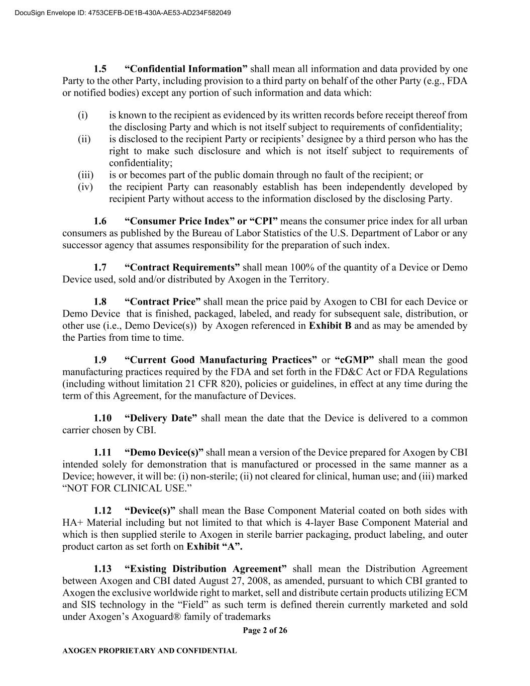 AXOGEN PROPRIETARY AND CONFIDENTIAL Page 2 of 26 1.5 “Confidential Information” shall mean all information and data provided by one Party to the other Party, including provision to a third party on behalf of the other Party (e.g., FDA or notified bodies) except any portion of such information and data which: (i) is known to the recipient as evidenced by its written records before receipt thereof from the disclosing Party and which is not itself subject to requirements of confidentiality; (ii) is disclosed to the recipient Party or recipients’ designee by a third person who has the right to make such disclosure and which is not itself subject to requirements of confidentiality; (iii) is or becomes part of the public domain through no fault of the recipient; or (iv) the recipient Party can reasonably establish has been independently developed by recipient Party without access to the information disclosed by the disclosing Party. 1.6 “Consumer Price Index” or “CPI” means the consumer price index for all urban consumers as published by the Bureau of Labor Statistics of the U.S. Department of Labor or any successor agency that assumes responsibility for the preparation of such index. 1.7 “Contract Requirements” shall mean 100% of the quantity of a Device or Demo Device used, sold and/or distributed by Axogen in the Territory. 1.8 “Contract Price” shall mean the price paid by Axogen to CBI for each Device or Demo Device that is finished, packaged, labeled, and ready for subsequent sale, distribution, or other use (i.e., Demo Device(s)) by Axogen referenced in Exhibit B and as may be amended by the Parties from time to time. 1.9 “Current Good Manufacturing Practices” or “cGMP” shall mean the good manufacturing practices required by the FDA and set forth in the FD&C Act or FDA Regulations (including without limitation 21 CFR 820), policies or guidelines, in effect at any time during the term of this Agreement, for the manufacture of Devices. 1.10 “Delivery Date” shall mean the date that the Device is delivered to a common carrier chosen by CBI. 1.11 “Demo Device(s)” shall mean a version of the Device prepared for Axogen by CBI intended solely for demonstration that is manufactured or processed in the same manner as a Device; however, it will be: (i) non-sterile; (ii) not cleared for clinical, human use; and (iii) marked “NOT FOR CLINICAL USE.” 1.12 “Device(s)” shall mean the Base Component Material coated on both sides with HA+ Material including but not limited to that which is 4-layer Base Component Material and which is then supplied sterile to Axogen in sterile barrier packaging, product labeling, and outer product carton as set forth on Exhibit “A”. 1.13 “Existing Distribution Agreement” shall mean the Distribution Agreement between Axogen and CBI dated August 27, 2008, as amended, pursuant to which CBI granted to Axogen the exclusive worldwide right to market, sell and distribute certain products utilizing ECM and SIS technology in the “Field” as such term is defined therein currently marketed and sold under Axogen’s Axoguard® family of trademarks DocuSign Envelope ID: 4753CEFB-DE1B-430A-AE53-AD234F582049