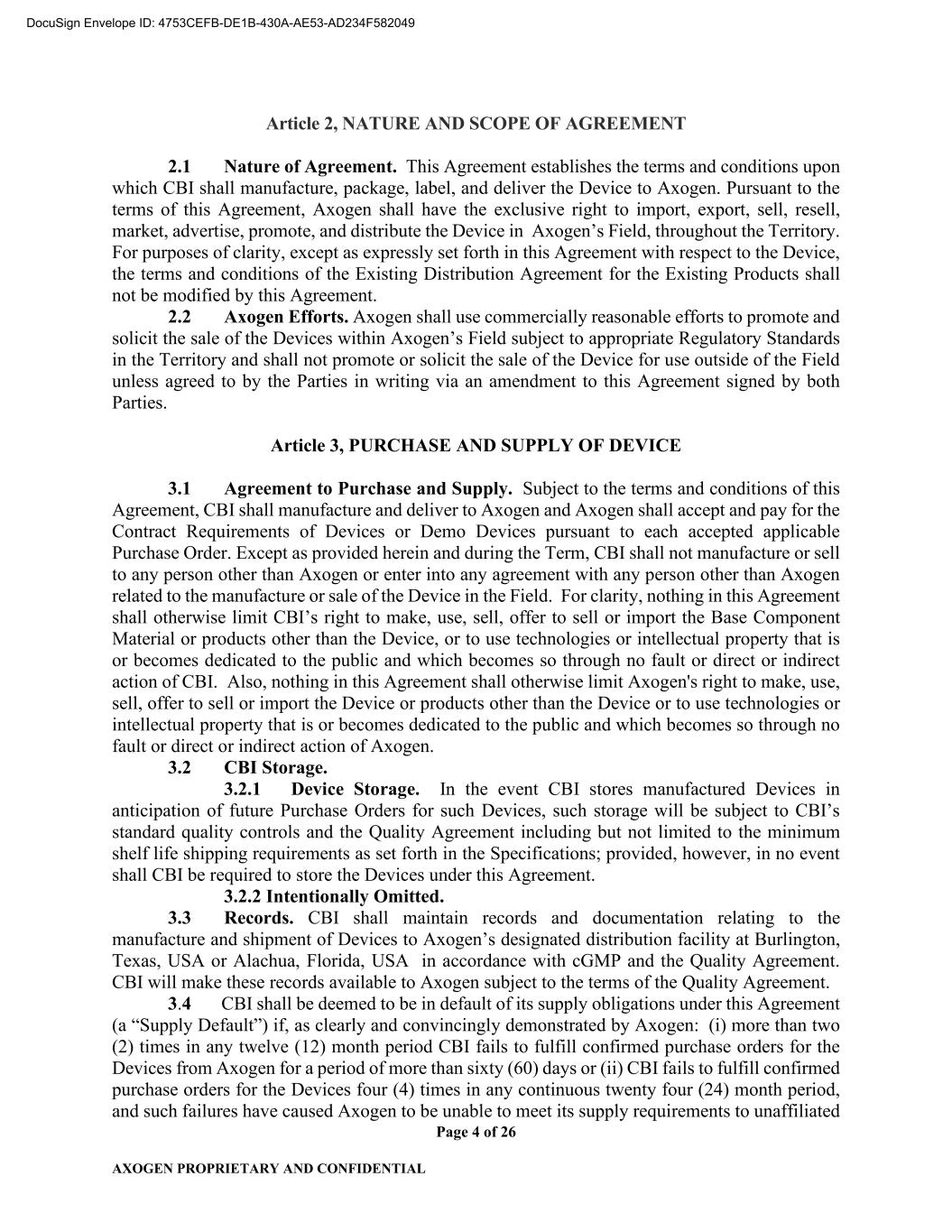 AXOGEN PROPRIETARY AND CONFIDENTIAL Page 4 of 26 Article 2, NATURE AND SCOPE OF AGREEMENT 2.1 Nature of Agreement. This Agreement establishes the terms and conditions upon which CBI shall manufacture, package, label, and deliver the Device to Axogen. Pursuant to the terms of this Agreement, Axogen shall have the exclusive right to import, export, sell, resell, market, advertise, promote, and distribute the Device in Axogen’s Field, throughout the Territory. For purposes of clarity, except as expressly set forth in this Agreement with respect to the Device, the terms and conditions of the Existing Distribution Agreement for the Existing Products shall not be modified by this Agreement. 2.2 Axogen Efforts. Axogen shall use commercially reasonable efforts to promote and solicit the sale of the Devices within Axogen’s Field subject to appropriate Regulatory Standards in the Territory and shall not promote or solicit the sale of the Device for use outside of the Field unless agreed to by the Parties in writing via an amendment to this Agreement signed by both Parties. Article 3, PURCHASE AND SUPPLY OF DEVICE 3.1 Agreement to Purchase and Supply. Subject to the terms and conditions of this Agreement, CBI shall manufacture and deliver to Axogen and Axogen shall accept and pay for the Contract Requirements of Devices or Demo Devices pursuant to each accepted applicable Purchase Order. Except as provided herein and during the Term, CBI shall not manufacture or sell to any person other than Axogen or enter into any agreement with any person other than Axogen related to the manufacture or sale of the Device in the Field. For clarity, nothing in this Agreement shall otherwise limit CBI’s right to make, use, sell, offer to sell or import the Base Component Material or products other than the Device, or to use technologies or intellectual property that is or becomes dedicated to the public and which becomes so through no fault or direct or indirect action of CBI. Also, nothing in this Agreement shall otherwise limit Axogen's right to make, use, sell, offer to sell or import the Device or products other than the Device or to use technologies or intellectual property that is or becomes dedicated to the public and which becomes so through no fault or direct or indirect action of Axogen. 3.2 CBI Storage. 3.2.1 Device Storage. In the event CBI stores manufactured Devices in anticipation of future Purchase Orders for such Devices, such storage will be subject to CBI’s standard quality controls and the Quality Agreement including but not limited to the minimum shelf life shipping requirements as set forth in the Specifications; provided, however, in no event shall CBI be required to store the Devices under this Agreement. 3.2.2 Intentionally Omitted. 3.3 Records. CBI shall maintain records and documentation relating to the manufacture and shipment of Devices to Axogen’s designated distribution facility at Burlington, Texas, USA or Alachua, Florida, USA in accordance with cGMP and the Quality Agreement. CBI will make these records available to Axogen subject to the terms of the Quality Agreement. 3.4 CBI shall be deemed to be in default of its supply obligations under this Agreement (a “Supply Default”) if, as clearly and convincingly demonstrated by Axogen: (i) more than two (2) times in any twelve (12) month period CBI fails to fulfill confirmed purchase orders for the Devices from Axogen for a period of more than sixty (60) days or (ii) CBI fails to fulfill confirmed purchase orders for the Devices four (4) times in any continuous twenty four (24) month period, and such failures have caused Axogen to be unable to meet its supply requirements to unaffiliated DocuSign Envelope ID: 4753CEFB-DE1B-430A-AE53-AD234F582049