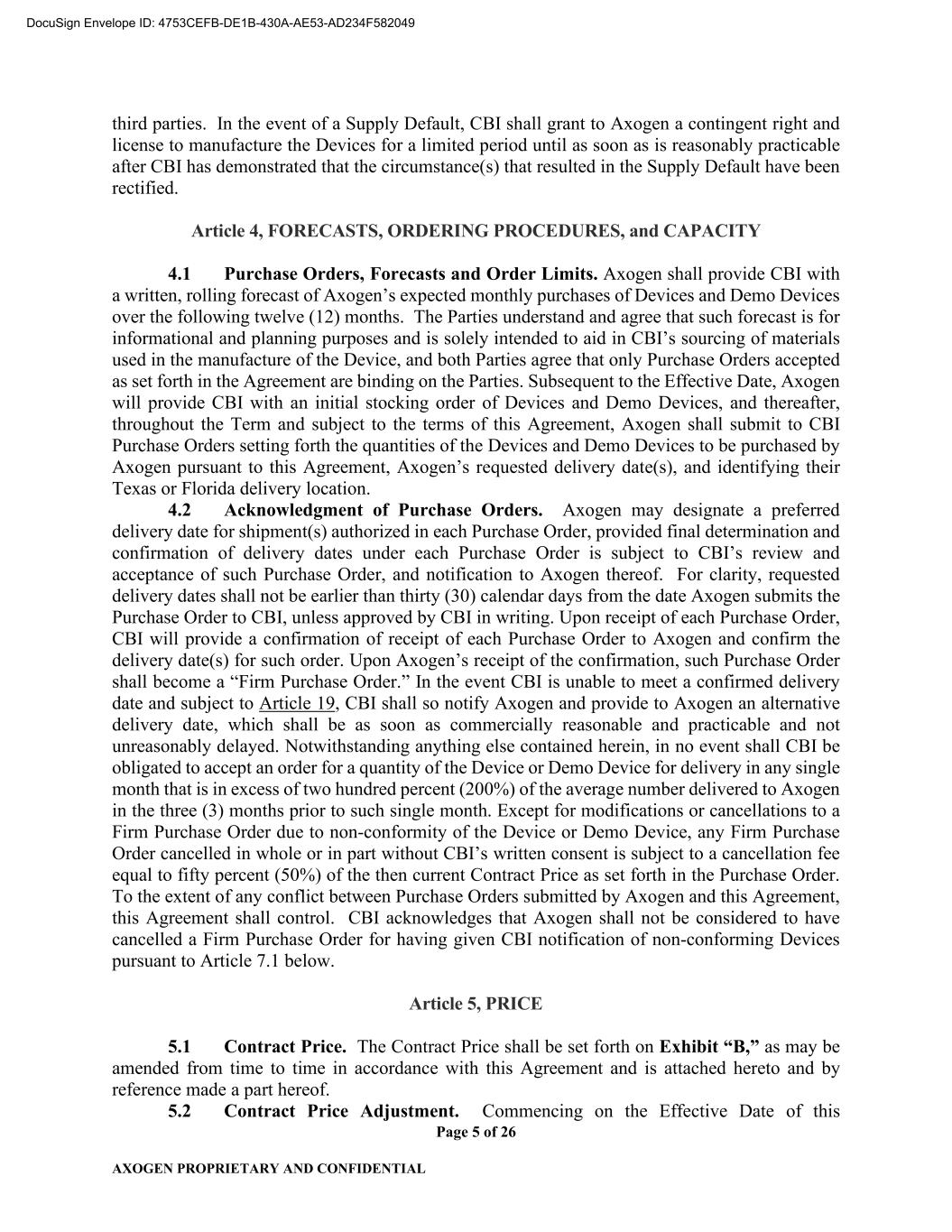 AXOGEN PROPRIETARY AND CONFIDENTIAL Page 5 of 26 third parties. In the event of a Supply Default, CBI shall grant to Axogen a contingent right and license to manufacture the Devices for a limited period until as soon as is reasonably practicable after CBI has demonstrated that the circumstance(s) that resulted in the Supply Default have been rectified. Article 4, FORECASTS, ORDERING PROCEDURES, and CAPACITY 4.1 Purchase Orders, Forecasts and Order Limits. Axogen shall provide CBI with a written, rolling forecast of Axogen’s expected monthly purchases of Devices and Demo Devices over the following twelve (12) months. The Parties understand and agree that such forecast is for informational and planning purposes and is solely intended to aid in CBI’s sourcing of materials used in the manufacture of the Device, and both Parties agree that only Purchase Orders accepted as set forth in the Agreement are binding on the Parties. Subsequent to the Effective Date, Axogen will provide CBI with an initial stocking order of Devices and Demo Devices, and thereafter, throughout the Term and subject to the terms of this Agreement, Axogen shall submit to CBI Purchase Orders setting forth the quantities of the Devices and Demo Devices to be purchased by Axogen pursuant to this Agreement, Axogen’s requested delivery date(s), and identifying their Texas or Florida delivery location. 4.2 Acknowledgment of Purchase Orders. Axogen may designate a preferred delivery date for shipment(s) authorized in each Purchase Order, provided final determination and confirmation of delivery dates under each Purchase Order is subject to CBI’s review and acceptance of such Purchase Order, and notification to Axogen thereof. For clarity, requested delivery dates shall not be earlier than thirty (30) calendar days from the date Axogen submits the Purchase Order to CBI, unless approved by CBI in writing. Upon receipt of each Purchase Order, CBI will provide a confirmation of receipt of each Purchase Order to Axogen and confirm the delivery date(s) for such order. Upon Axogen’s receipt of the confirmation, such Purchase Order shall become a “Firm Purchase Order.” In the event CBI is unable to meet a confirmed delivery date and subject to Article 19, CBI shall so notify Axogen and provide to Axogen an alternative delivery date, which shall be as soon as commercially reasonable and practicable and not unreasonably delayed. Notwithstanding anything else contained herein, in no event shall CBI be obligated to accept an order for a quantity of the Device or Demo Device for delivery in any single month that is in excess of two hundred percent (200%) of the average number delivered to Axogen in the three (3) months prior to such single month. Except for modifications or cancellations to a Firm Purchase Order due to non-conformity of the Device or Demo Device, any Firm Purchase Order cancelled in whole or in part without CBI’s written consent is subject to a cancellation fee equal to fifty percent (50%) of the then current Contract Price as set forth in the Purchase Order. To the extent of any conflict between Purchase Orders submitted by Axogen and this Agreement, this Agreement shall control. CBI acknowledges that Axogen shall not be considered to have cancelled a Firm Purchase Order for having given CBI notification of non-conforming Devices pursuant to Article 7.1 below. Article 5, PRICE 5.1 Contract Price. The Contract Price shall be set forth on Exhibit “B,” as may be amended from time to time in accordance with this Agreement and is attached hereto and by reference made a part hereof. 5.2 Contract Price Adjustment. Commencing on the Effective Date of this DocuSign Envelope ID: 4753CEFB-DE1B-430A-AE53-AD234F582049