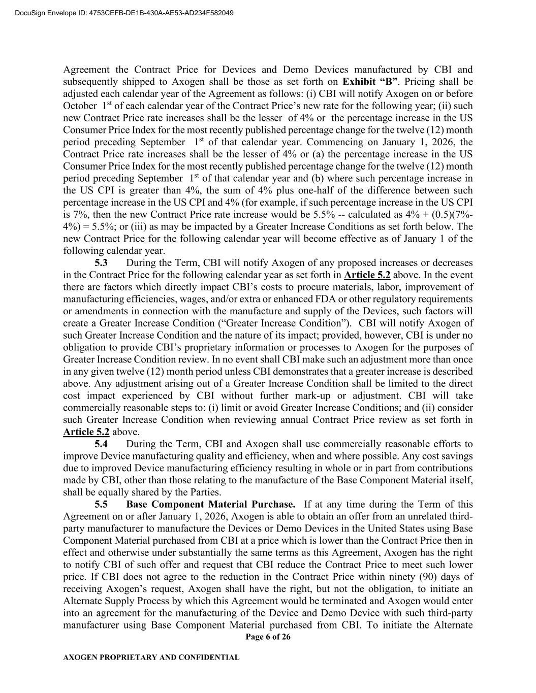 AXOGEN PROPRIETARY AND CONFIDENTIAL Page 6 of 26 Agreement the Contract Price for Devices and Demo Devices manufactured by CBI and subsequently shipped to Axogen shall be those as set forth on Exhibit “B”. Pricing shall be adjusted each calendar year of the Agreement as follows: (i) CBI will notify Axogen on or before October 1st of each calendar year of the Contract Price’s new rate for the following year; (ii) such new Contract Price rate increases shall be the lesser of 4% or the percentage increase in the US Consumer Price Index for the most recently published percentage change for the twelve (12) month period preceding September 1st of that calendar year. Commencing on January 1, 2026, the Contract Price rate increases shall be the lesser of 4% or (a) the percentage increase in the US Consumer Price Index for the most recently published percentage change for the twelve (12) month period preceding September 1st of that calendar year and (b) where such percentage increase in the US CPI is greater than 4%, the sum of 4% plus one-half of the difference between such percentage increase in the US CPI and 4% (for example, if such percentage increase in the US CPI is 7%, then the new Contract Price rate increase would be 5.5% -- calculated as 4% + (0.5)(7%- 4%) = 5.5%; or (iii) as may be impacted by a Greater Increase Conditions as set forth below. The new Contract Price for the following calendar year will become effective as of January 1 of the following calendar year. 5.3 During the Term, CBI will notify Axogen of any proposed increases or decreases in the Contract Price for the following calendar year as set forth in Article 5.2 above. In the event there are factors which directly impact CBI’s costs to procure materials, labor, improvement of manufacturing efficiencies, wages, and/or extra or enhanced FDA or other regulatory requirements or amendments in connection with the manufacture and supply of the Devices, such factors will create a Greater Increase Condition (“Greater Increase Condition”). CBI will notify Axogen of such Greater Increase Condition and the nature of its impact; provided, however, CBI is under no obligation to provide CBI’s proprietary information or processes to Axogen for the purposes of Greater Increase Condition review. In no event shall CBI make such an adjustment more than once in any given twelve (12) month period unless CBI demonstrates that a greater increase is described above. Any adjustment arising out of a Greater Increase Condition shall be limited to the direct cost impact experienced by CBI without further mark-up or adjustment. CBI will take commercially reasonable steps to: (i) limit or avoid Greater Increase Conditions; and (ii) consider such Greater Increase Condition when reviewing annual Contract Price review as set forth in Article 5.2 above. 5.4 During the Term, CBI and Axogen shall use commercially reasonable efforts to improve Device manufacturing quality and efficiency, when and where possible. Any cost savings due to improved Device manufacturing efficiency resulting in whole or in part from contributions made by CBI, other than those relating to the manufacture of the Base Component Material itself, shall be equally shared by the Parties. 5.5 Base Component Material Purchase. If at any time during the Term of this Agreement on or after January 1, 2026, Axogen is able to obtain an offer from an unrelated third- party manufacturer to manufacture the Devices or Demo Devices in the United States using Base Component Material purchased from CBI at a price which is lower than the Contract Price then in effect and otherwise under substantially the same terms as this Agreement, Axogen has the right to notify CBI of such offer and request that CBI reduce the Contract Price to meet such lower price. If CBI does not agree to the reduction in the Contract Price within ninety (90) days of receiving Axogen’s request, Axogen shall have the right, but not the obligation, to initiate an Alternate Supply Process by which this Agreement would be terminated and Axogen would enter into an agreement for the manufacturing of the Device and Demo Device with such third-party manufacturer using Base Component Material purchased from CBI. To initiate the Alternate DocuSign Envelope ID: 4753CEFB-DE1B-430A-AE53-AD234F582049