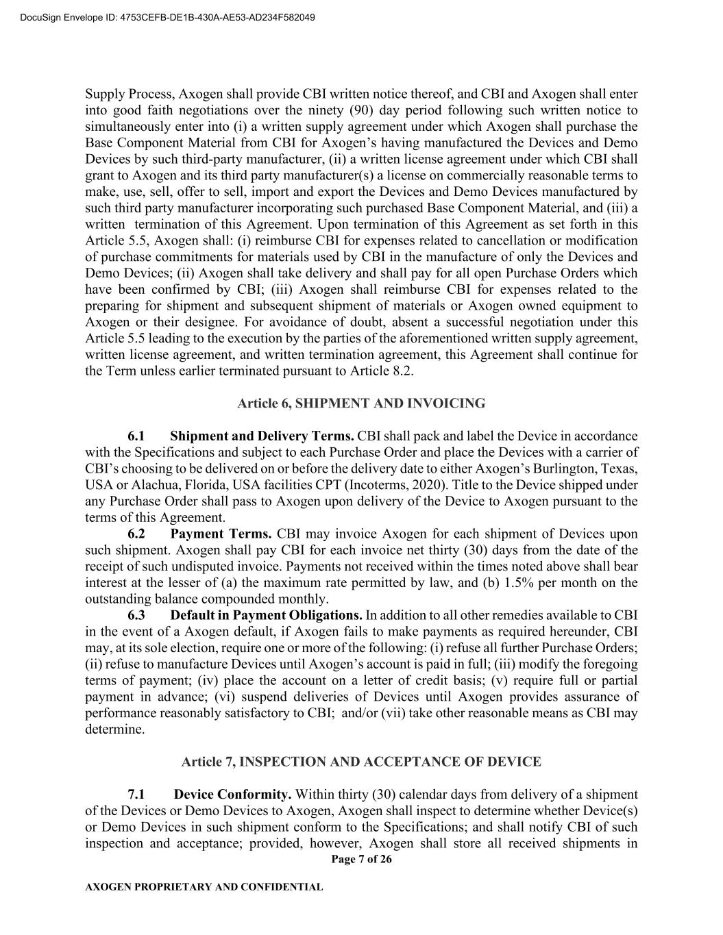 AXOGEN PROPRIETARY AND CONFIDENTIAL Page 7 of 26 Supply Process, Axogen shall provide CBI written notice thereof, and CBI and Axogen shall enter into good faith negotiations over the ninety (90) day period following such written notice to simultaneously enter into (i) a written supply agreement under which Axogen shall purchase the Base Component Material from CBI for Axogen’s having manufactured the Devices and Demo Devices by such third-party manufacturer, (ii) a written license agreement under which CBI shall grant to Axogen and its third party manufacturer(s) a license on commercially reasonable terms to make, use, sell, offer to sell, import and export the Devices and Demo Devices manufactured by such third party manufacturer incorporating such purchased Base Component Material, and (iii) a written termination of this Agreement. Upon termination of this Agreement as set forth in this Article 5.5, Axogen shall: (i) reimburse CBI for expenses related to cancellation or modification of purchase commitments for materials used by CBI in the manufacture of only the Devices and Demo Devices; (ii) Axogen shall take delivery and shall pay for all open Purchase Orders which have been confirmed by CBI; (iii) Axogen shall reimburse CBI for expenses related to the preparing for shipment and subsequent shipment of materials or Axogen owned equipment to Axogen or their designee. For avoidance of doubt, absent a successful negotiation under this Article 5.5 leading to the execution by the parties of the aforementioned written supply agreement, written license agreement, and written termination agreement, this Agreement shall continue for the Term unless earlier terminated pursuant to Article 8.2. Article 6, SHIPMENT AND INVOICING 6.1 Shipment and Delivery Terms. CBI shall pack and label the Device in accordance with the Specifications and subject to each Purchase Order and place the Devices with a carrier of CBI’s choosing to be delivered on or before the delivery date to either Axogen’s Burlington, Texas, USA or Alachua, Florida, USA facilities CPT (Incoterms, 2020). Title to the Device shipped under any Purchase Order shall pass to Axogen upon delivery of the Device to Axogen pursuant to the terms of this Agreement. 6.2 Payment Terms. CBI may invoice Axogen for each shipment of Devices upon such shipment. Axogen shall pay CBI for each invoice net thirty (30) days from the date of the receipt of such undisputed invoice. Payments not received within the times noted above shall bear interest at the lesser of (a) the maximum rate permitted by law, and (b) 1.5% per month on the outstanding balance compounded monthly. 6.3 Default in Payment Obligations. In addition to all other remedies available to CBI in the event of a Axogen default, if Axogen fails to make payments as required hereunder, CBI may, at its sole election, require one or more of the following: (i) refuse all further Purchase Orders; (ii) refuse to manufacture Devices until Axogen’s account is paid in full; (iii) modify the foregoing terms of payment; (iv) place the account on a letter of credit basis; (v) require full or partial payment in advance; (vi) suspend deliveries of Devices until Axogen provides assurance of performance reasonably satisfactory to CBI; and/or (vii) take other reasonable means as CBI may determine. Article 7, INSPECTION AND ACCEPTANCE OF DEVICE 7.1 Device Conformity. Within thirty (30) calendar days from delivery of a shipment of the Devices or Demo Devices to Axogen, Axogen shall inspect to determine whether Device(s) or Demo Devices in such shipment conform to the Specifications; and shall notify CBI of such inspection and acceptance; provided, however, Axogen shall store all received shipments in DocuSign Envelope ID: 4753CEFB-DE1B-430A-AE53-AD234F582049