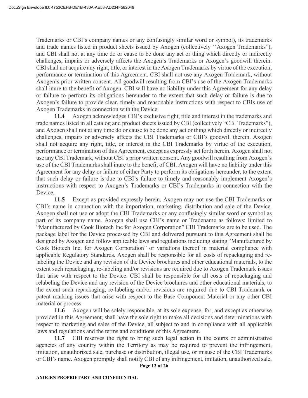 AXOGEN PROPRIETARY AND CONFIDENTIAL Page 12 of 26 Trademarks or CBI’s company names or any confusingly similar word or symbol), its trademarks and trade names listed in product sheets issued by Axogen (collectively ‘‘Axogen Trademarks”), and CBI shall not at any time do or cause to be done any act or thing which directly or indirectly challenges, impairs or adversely affects the Axogen’s Trademarks or Axogen’s goodwill therein. CBI shall not acquire any right, title, or interest in the Axogen Trademarks by virtue of the execution, performance or termination of this Agreement. CBI shall not use any Axogen Trademark, without Axogen’s prior written consent. All goodwill resulting from CBI’s use of the Axogen Trademarks shall inure to the benefit of Axogen. CBI will have no liability under this Agreement for any delay or failure to perform its obligations hereunder to the extent that such delay or failure is due to Axogen’s failure to provide clear, timely and reasonable instructions with respect to CBIs use of Axogen Trademarks in connection with the Device. 11.4 Axogen acknowledges CBI’s exclusive right, title and interest in the trademarks and trade names listed in all catalog and product sheets issued by CBI (collectively “CBI Trademarks”), and Axogen shall not at any time do or cause to be done any act or thing which directly or indirectly challenges, impairs or adversely affects the CBI Trademarks or CBI’s goodwill therein. Axogen shall not acquire any right, title, or interest in the CBI Trademarks by virtue of the execution, performance or termination of this Agreement, except as expressly set forth herein. Axogen shall not use any CBI Trademark, without CBI’s prior written consent. Any goodwill resulting from Axogen’s use of the CBI Trademarks shall inure to the benefit of CBI. Axogen will have no liability under this Agreement for any delay or failure of either Party to perform its obligations hereunder, to the extent that such delay or failure is due to CBI’s failure to timely and reasonably implement Axogen’s instructions with respect to Axogen’s Trademarks or CBI’s Trademarks in connection with the Device. 11.5 Except as provided expressly herein, Axogen may not use the CBI Trademarks or CBI’s name in connection with the importation, marketing, distribution and sale of the Device. Axogen shall not use or adopt the CBI Trademarks or any confusingly similar word or symbol as part of its company name. Axogen shall use CBI’s name or Tradename as follows: limited to “Manufactured by Cook Biotech Inc for Axogen Corporation” CBI Trademarks are to be used. The package label for the Device processed by CBI and delivered pursuant to this Agreement shall be designed by Axogen and follow applicable laws and regulations including stating “Manufactured by Cook Biotech Inc. for Axogen Corporation” or variations thereof in material compliance with applicable Regulatory Standards. Axogen shall be responsible for all costs of repackaging and re- labeling the Device and any revision of the Device brochures and other educational materials, to the extent such repackaging, re-labeling and/or revisions are required due to Axogen Trademark issues that arise with respect to the Device. CBI shall be responsible for all costs of repackaging and relabeling the Device and any revision of the Device brochures and other educational materials, to the extent such repackaging, re-labeling and/or revisions are required due to CBI Trademark or patent marking issues that arise with respect to the Base Component Material or any other CBI material or process. 11.6 Axogen will be solely responsible, at its sole expense, for, and except as otherwise provided in this Agreement, shall have the sole right to make all decisions and determinations with respect to marketing and sales of the Device, all subject to and in compliance with all applicable laws and regulations and the terms and conditions of this Agreement. 11.7 CBI reserves the right to bring such legal action in the courts or administrative agencies of any country within the Territory as may be required to prevent the infringement, imitation, unauthorized sale, purchase or distribution, illegal use, or misuse of the CBI Trademarks or CBI’s name. Axogen promptly shall notify CBI of any infringement, imitation, unauthorized sale, DocuSign Envelope ID: 4753CEFB-DE1B-430A-AE53-AD234F582049