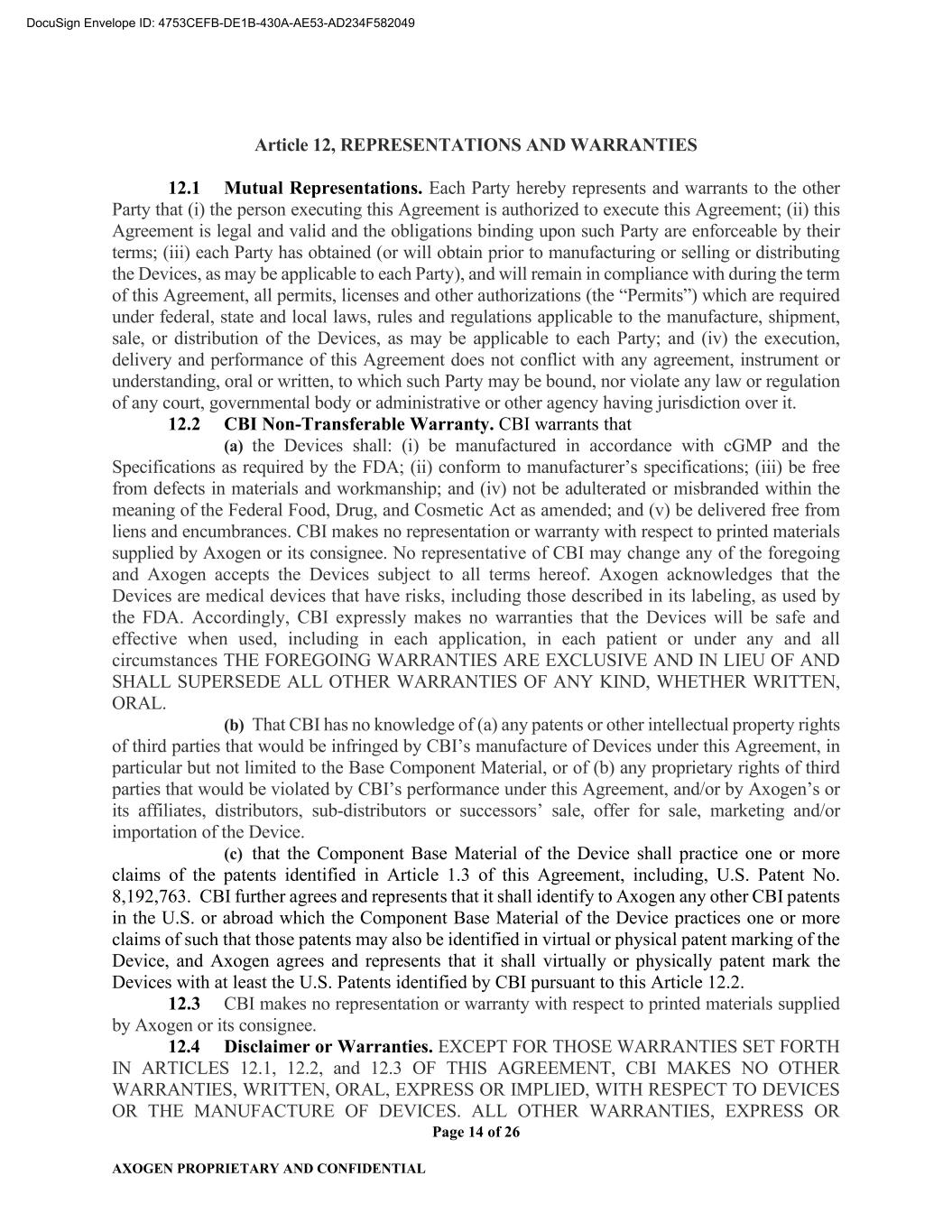 AXOGEN PROPRIETARY AND CONFIDENTIAL Page 14 of 26 Article 12, REPRESENTATIONS AND WARRANTIES 12.1 Mutual Representations. Each Party hereby represents and warrants to the other Party that (i) the person executing this Agreement is authorized to execute this Agreement; (ii) this Agreement is legal and valid and the obligations binding upon such Party are enforceable by their terms; (iii) each Party has obtained (or will obtain prior to manufacturing or selling or distributing the Devices, as may be applicable to each Party), and will remain in compliance with during the term of this Agreement, all permits, licenses and other authorizations (the “Permits”) which are required under federal, state and local laws, rules and regulations applicable to the manufacture, shipment, sale, or distribution of the Devices, as may be applicable to each Party; and (iv) the execution, delivery and performance of this Agreement does not conflict with any agreement, instrument or understanding, oral or written, to which such Party may be bound, nor violate any law or regulation of any court, governmental body or administrative or other agency having jurisdiction over it. 12.2 CBI Non-Transferable Warranty. CBI warrants that (a) the Devices shall: (i) be manufactured in accordance with cGMP and the Specifications as required by the FDA; (ii) conform to manufacturer’s specifications; (iii) be free from defects in materials and workmanship; and (iv) not be adulterated or misbranded within the meaning of the Federal Food, Drug, and Cosmetic Act as amended; and (v) be delivered free from liens and encumbrances. CBI makes no representation or warranty with respect to printed materials supplied by Axogen or its consignee. No representative of CBI may change any of the foregoing and Axogen accepts the Devices subject to all terms hereof. Axogen acknowledges that the Devices are medical devices that have risks, including those described in its labeling, as used by the FDA. Accordingly, CBI expressly makes no warranties that the Devices will be safe and effective when used, including in each application, in each patient or under any and all circumstances THE FOREGOING WARRANTIES ARE EXCLUSIVE AND IN LIEU OF AND SHALL SUPERSEDE ALL OTHER WARRANTIES OF ANY KIND, WHETHER WRITTEN, ORAL. (b) That CBI has no knowledge of (a) any patents or other intellectual property rights of third parties that would be infringed by CBI’s manufacture of Devices under this Agreement, in particular but not limited to the Base Component Material, or of (b) any proprietary rights of third parties that would be violated by CBI’s performance under this Agreement, and/or by Axogen’s or its affiliates, distributors, sub-distributors or successors’ sale, offer for sale, marketing and/or importation of the Device. (c) that the Component Base Material of the Device shall practice one or more claims of the patents identified in Article 1.3 of this Agreement, including, U.S. Patent No. 8,192,763. CBI further agrees and represents that it shall identify to Axogen any other CBI patents in the U.S. or abroad which the Component Base Material of the Device practices one or more claims of such that those patents may also be identified in virtual or physical patent marking of the Device, and Axogen agrees and represents that it shall virtually or physically patent mark the Devices with at least the U.S. Patents identified by CBI pursuant to this Article 12.2. 12.3 CBI makes no representation or warranty with respect to printed materials supplied by Axogen or its consignee. 12.4 Disclaimer or Warranties. EXCEPT FOR THOSE WARRANTIES SET FORTH IN ARTICLES 12.1, 12.2, and 12.3 OF THIS AGREEMENT, CBI MAKES NO OTHER WARRANTIES, WRITTEN, ORAL, EXPRESS OR IMPLIED, WITH RESPECT TO DEVICES OR THE MANUFACTURE OF DEVICES. ALL OTHER WARRANTIES, EXPRESS OR DocuSign Envelope ID: 4753CEFB-DE1B-430A-AE53-AD234F582049