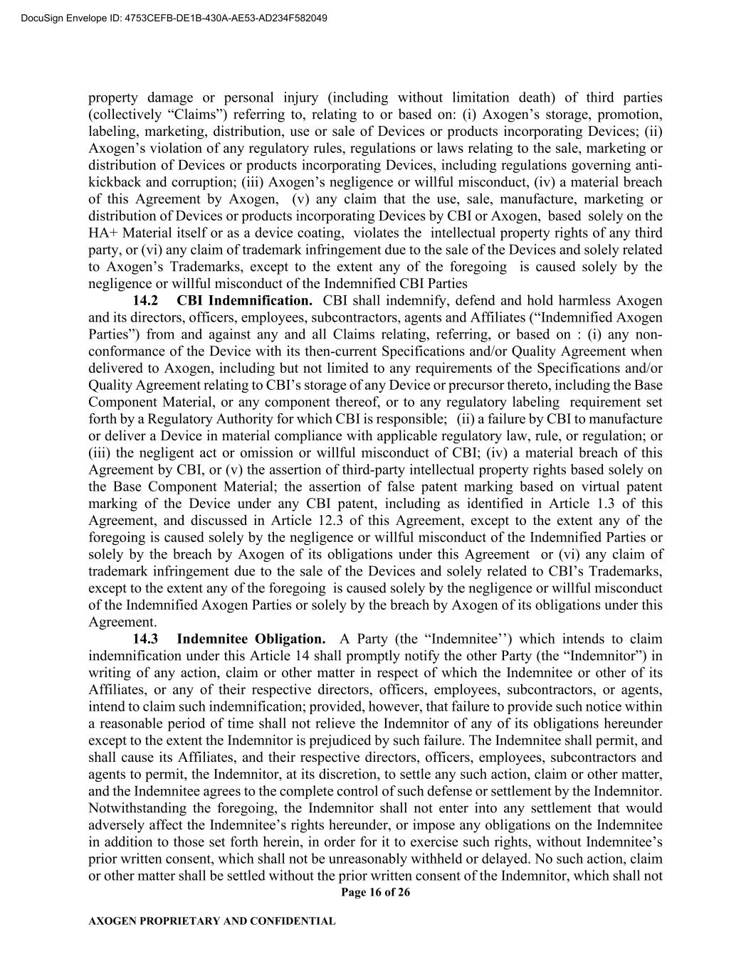 AXOGEN PROPRIETARY AND CONFIDENTIAL Page 16 of 26 property damage or personal injury (including without limitation death) of third parties (collectively “Claims”) referring to, relating to or based on: (i) Axogen’s storage, promotion, labeling, marketing, distribution, use or sale of Devices or products incorporating Devices; (ii) Axogen’s violation of any regulatory rules, regulations or laws relating to the sale, marketing or distribution of Devices or products incorporating Devices, including regulations governing anti- kickback and corruption; (iii) Axogen’s negligence or willful misconduct, (iv) a material breach of this Agreement by Axogen, (v) any claim that the use, sale, manufacture, marketing or distribution of Devices or products incorporating Devices by CBI or Axogen, based solely on the HA+ Material itself or as a device coating, violates the intellectual property rights of any third party, or (vi) any claim of trademark infringement due to the sale of the Devices and solely related to Axogen’s Trademarks, except to the extent any of the foregoing is caused solely by the negligence or willful misconduct of the Indemnified CBI Parties 14.2 CBI Indemnification. CBI shall indemnify, defend and hold harmless Axogen and its directors, officers, employees, subcontractors, agents and Affiliates (“Indemnified Axogen Parties”) from and against any and all Claims relating, referring, or based on : (i) any non- conformance of the Device with its then-current Specifications and/or Quality Agreement when delivered to Axogen, including but not limited to any requirements of the Specifications and/or Quality Agreement relating to CBI’s storage of any Device or precursor thereto, including the Base Component Material, or any component thereof, or to any regulatory labeling requirement set forth by a Regulatory Authority for which CBI is responsible; (ii) a failure by CBI to manufacture or deliver a Device in material compliance with applicable regulatory law, rule, or regulation; or (iii) the negligent act or omission or willful misconduct of CBI; (iv) a material breach of this Agreement by CBI, or (v) the assertion of third-party intellectual property rights based solely on the Base Component Material; the assertion of false patent marking based on virtual patent marking of the Device under any CBI patent, including as identified in Article 1.3 of this Agreement, and discussed in Article 12.3 of this Agreement, except to the extent any of the foregoing is caused solely by the negligence or willful misconduct of the Indemnified Parties or solely by the breach by Axogen of its obligations under this Agreement or (vi) any claim of trademark infringement due to the sale of the Devices and solely related to CBI’s Trademarks, except to the extent any of the foregoing is caused solely by the negligence or willful misconduct of the Indemnified Axogen Parties or solely by the breach by Axogen of its obligations under this Agreement. 14.3 Indemnitee Obligation. A Party (the “Indemnitee’’) which intends to claim indemnification under this Article 14 shall promptly notify the other Party (the “Indemnitor”) in writing of any action, claim or other matter in respect of which the Indemnitee or other of its Affiliates, or any of their respective directors, officers, employees, subcontractors, or agents, intend to claim such indemnification; provided, however, that failure to provide such notice within a reasonable period of time shall not relieve the Indemnitor of any of its obligations hereunder except to the extent the Indemnitor is prejudiced by such failure. The Indemnitee shall permit, and shall cause its Affiliates, and their respective directors, officers, employees, subcontractors and agents to permit, the Indemnitor, at its discretion, to settle any such action, claim or other matter, and the Indemnitee agrees to the complete control of such defense or settlement by the Indemnitor. Notwithstanding the foregoing, the Indemnitor shall not enter into any settlement that would adversely affect the Indemnitee’s rights hereunder, or impose any obligations on the Indemnitee in addition to those set forth herein, in order for it to exercise such rights, without Indemnitee’s prior written consent, which shall not be unreasonably withheld or delayed. No such action, claim or other matter shall be settled without the prior written consent of the Indemnitor, which shall not DocuSign Envelope ID: 4753CEFB-DE1B-430A-AE53-AD234F582049