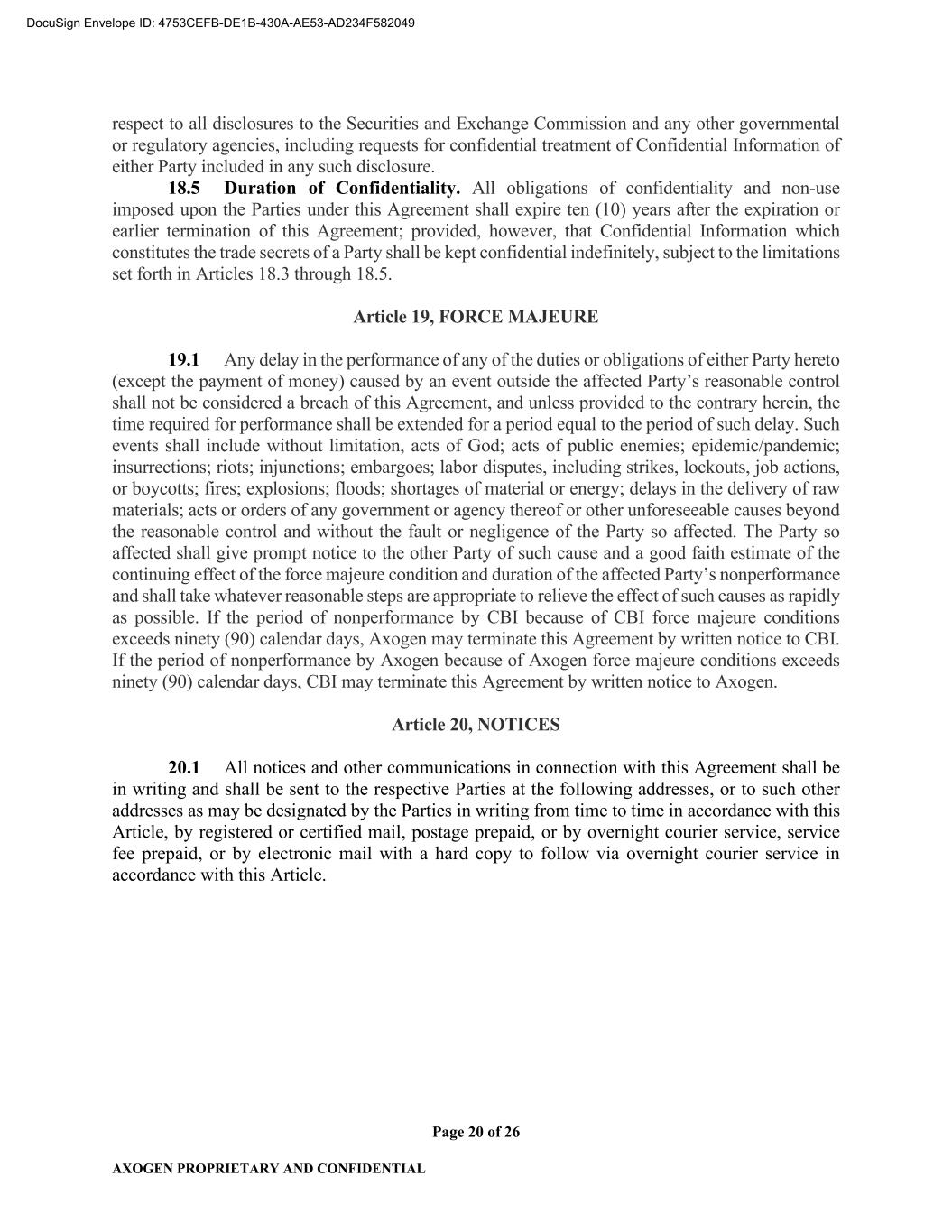 AXOGEN PROPRIETARY AND CONFIDENTIAL Page 20 of 26 respect to all disclosures to the Securities and Exchange Commission and any other governmental or regulatory agencies, including requests for confidential treatment of Confidential Information of either Party included in any such disclosure. 18.5 Duration of Confidentiality. All obligations of confidentiality and non-use imposed upon the Parties under this Agreement shall expire ten (10) years after the expiration or earlier termination of this Agreement; provided, however, that Confidential Information which constitutes the trade secrets of a Party shall be kept confidential indefinitely, subject to the limitations set forth in Articles 18.3 through 18.5. Article 19, FORCE MAJEURE 19.1 Any delay in the performance of any of the duties or obligations of either Party hereto (except the payment of money) caused by an event outside the affected Party’s reasonable control shall not be considered a breach of this Agreement, and unless provided to the contrary herein, the time required for performance shall be extended for a period equal to the period of such delay. Such events shall include without limitation, acts of God; acts of public enemies; epidemic/pandemic; insurrections; riots; injunctions; embargoes; labor disputes, including strikes, lockouts, job actions, or boycotts; fires; explosions; floods; shortages of material or energy; delays in the delivery of raw materials; acts or orders of any government or agency thereof or other unforeseeable causes beyond the reasonable control and without the fault or negligence of the Party so affected. The Party so affected shall give prompt notice to the other Party of such cause and a good faith estimate of the continuing effect of the force majeure condition and duration of the affected Party’s nonperformance and shall take whatever reasonable steps are appropriate to relieve the effect of such causes as rapidly as possible. If the period of nonperformance by CBI because of CBI force majeure conditions exceeds ninety (90) calendar days, Axogen may terminate this Agreement by written notice to CBI. If the period of nonperformance by Axogen because of Axogen force majeure conditions exceeds ninety (90) calendar days, CBI may terminate this Agreement by written notice to Axogen. Article 20, NOTICES 20.1 All notices and other communications in connection with this Agreement shall be in writing and shall be sent to the respective Parties at the following addresses, or to such other addresses as may be designated by the Parties in writing from time to time in accordance with this Article, by registered or certified mail, postage prepaid, or by overnight courier service, service fee prepaid, or by electronic mail with a hard copy to follow via overnight courier service in accordance with this Article. DocuSign Envelope ID: 4753CEFB-DE1B-430A-AE53-AD234F582049
