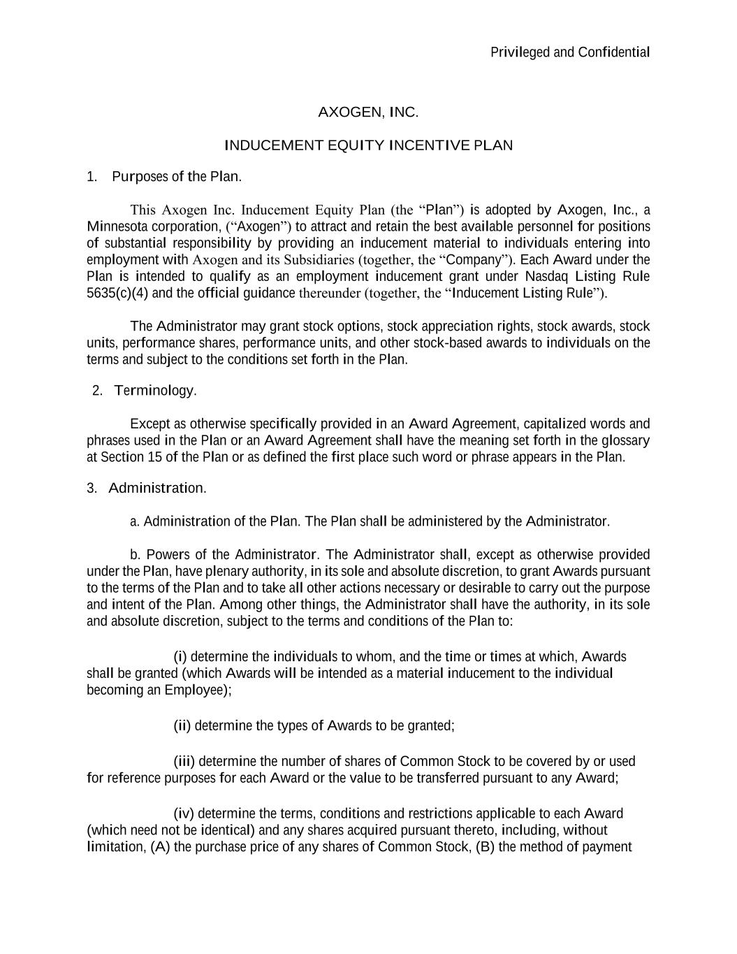Privileged and Confidential AXOGEN, INC. INDUCEMENT EQUITY INCENTIVE PLAN 1. Purposes of the Plan. This Axogen Inc. Inducement Equity Plan (the “Plan”) is adopted by Axogen, Inc., a Minnesota corporation, (“Axogen”) to attract and retain the best available personnel for positions of substantial responsibility by providing an inducement material to individuals entering into employment with Axogen and its Subsidiaries (together, the “Company”). Each Award under the Plan is intended to qualify as an employment inducement grant under Nasdaq Listing Rule 5635(c)(4) and the official guidance thereunder (together, the “Inducement Listing Rule”). The Administrator may grant stock options, stock appreciation rights, stock awards, stock units, performance shares, performance units, and other stock-based awards to individuals on the terms and subject to the conditions set forth in the Plan. 2. Terminology. Except as otherwise specifically provided in an Award Agreement, capitalized words and phrases used in the Plan or an Award Agreement shall have the meaning set forth in the glossary at Section 15 of the Plan or as defined the first place such word or phrase appears in the Plan. 3. Administration. a. Administration of the Plan. The Plan shall be administered by the Administrator. b. Powers of the Administrator. The Administrator shall, except as otherwise provided under the Plan, have plenary authority, in its sole and absolute discretion, to grant Awards pursuant to the terms of the Plan and to take all other actions necessary or desirable to carry out the purpose and intent of the Plan. Among other things, the Administrator shall have the authority, in its sole and absolute discretion, subject to the terms and conditions of the Plan to: (i) determine the individuals to whom, and the time or times at which, Awards shall be granted (which Awards will be intended as a material inducement to the individual becoming an Employee); (ii) determine the types of Awards to be granted; (iii) determine the number of shares of Common Stock to be covered by or used for reference purposes for each Award or the value to be transferred pursuant to any Award; (iv) determine the terms, conditions and restrictions applicable to each Award (which need not be identical) and any shares acquired pursuant thereto, including, without limitation, (A) the purchase price of any shares of Common Stock, (B) the method of payment