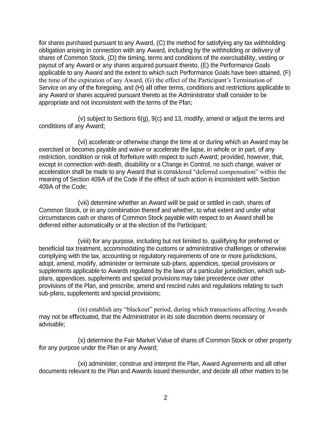 2 for shares purchased pursuant to any Award, (C) the method for satisfying any tax withholding obligation arising in connection with any Award, including by the withholding or delivery of shares of Common Stock, (D) the timing, terms and conditions of the exercisability, vesting or payout of any Award or any shares acquired pursuant thereto, (E) the Performance Goals applicable to any Award and the extent to which such Performance Goals have been attained, (F) the time of the expiration of any Award, (G) the effect of the Participant’s Termination of Service on any of the foregoing, and (H) all other terms, conditions and restrictions applicable to any Award or shares acquired pursuant thereto as the Administrator shall consider to be appropriate and not inconsistent with the terms of the Plan; (v) subject to Sections 6(g), 9(c) and 13, modify, amend or adjust the terms and conditions of any Award; (vi) accelerate or otherwise change the time at or during which an Award may be exercised or becomes payable and waive or accelerate the lapse, in whole or in part, of any restriction, condition or risk of forfeiture with respect to such Award; provided, however, that, except in connection with death, disability or a Change in Control, no such change, waiver or acceleration shall be made to any Award that is considered “deferred compensation” within the meaning of Section 409A of the Code if the effect of such action is inconsistent with Section 409A of the Code; (vii) determine whether an Award will be paid or settled in cash, shares of Common Stock, or in any combination thereof and whether, to what extent and under what circumstances cash or shares of Common Stock payable with respect to an Award shall be deferred either automatically or at the election of the Participant; (viii) for any purpose, including but not limited to, qualifying for preferred or beneficial tax treatment, accommodating the customs or administrative challenges or otherwise complying with the tax, accounting or regulatory requirements of one or more jurisdictions, adopt, amend, modify, administer or terminate sub-plans, appendices, special provisions or supplements applicable to Awards regulated by the laws of a particular jurisdiction, which sub- plans, appendices, supplements and special provisions may take precedence over other provisions of the Plan, and prescribe, amend and rescind rules and regulations relating to such sub-plans, supplements and special provisions; (ix) establish any “blackout” period, during which transactions affecting Awards may not be effectuated, that the Administrator in its sole discretion deems necessary or advisable; (x) determine the Fair Market Value of shares of Common Stock or other property for any purpose under the Plan or any Award; (xi) administer, construe and interpret the Plan, Award Agreements and all other documents relevant to the Plan and Awards issued thereunder, and decide all other matters to be