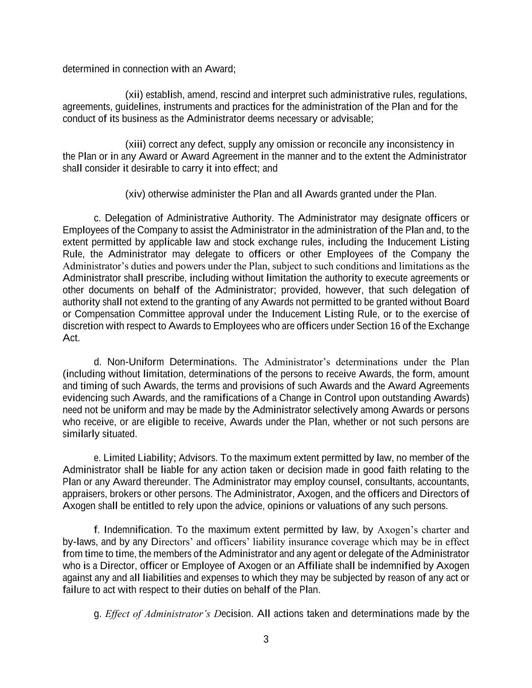 3 determined in connection with an Award; (xii) establish, amend, rescind and interpret such administrative rules, regulations, agreements, guidelines, instruments and practices for the administration of the Plan and for the conduct of its business as the Administrator deems necessary or advisable; (xiii) correct any defect, supply any omission or reconcile any inconsistency in the Plan or in any Award or Award Agreement in the manner and to the extent the Administrator shall consider it desirable to carry it into effect; and (xiv) otherwise administer the Plan and all Awards granted under the Plan. c. Delegation of Administrative Authority. The Administrator may designate officers or Employees of the Company to assist the Administrator in the administration of the Plan and, to the extent permitted by applicable law and stock exchange rules, including the Inducement Listing Rule, the Administrator may delegate to officers or other Employees of the Company the Administrator’s duties and powers under the Plan, subject to such conditions and limitations as the Administrator shall prescribe, including without limitation the authority to execute agreements or other documents on behalf of the Administrator; provided, however, that such delegation of authority shall not extend to the granting of any Awards not permitted to be granted without Board or Compensation Committee approval under the Inducement Listing Rule, or to the exercise of discretion with respect to Awards to Employees who are officers under Section 16 of the Exchange Act. d. Non-Uniform Determinations. The Administrator’s determinations under the Plan (including without limitation, determinations of the persons to receive Awards, the form, amount and timing of such Awards, the terms and provisions of such Awards and the Award Agreements evidencing such Awards, and the ramifications of a Change in Control upon outstanding Awards) need not be uniform and may be made by the Administrator selectively among Awards or persons who receive, or are eligible to receive, Awards under the Plan, whether or not such persons are similarly situated. e. Limited Liability; Advisors. To the maximum extent permitted by law, no member of the Administrator shall be liable for any action taken or decision made in good faith relating to the Plan or any Award thereunder. The Administrator may employ counsel, consultants, accountants, appraisers, brokers or other persons. The Administrator, Axogen, and the officers and Directors of Axogen shall be entitled to rely upon the advice, opinions or valuations of any such persons. f. Indemnification. To the maximum extent permitted by law, by Axogen’s charter and by-laws, and by any Directors’ and officers’ liability insurance coverage which may be in effect from time to time, the members of the Administrator and any agent or delegate of the Administrator who is a Director, officer or Employee of Axogen or an Affiliate shall be indemnified by Axogen against any and all liabilities and expenses to which they may be subjected by reason of any act or failure to act with respect to their duties on behalf of the Plan. g. Effect of Administrator’s Decision. All actions taken and determinations made by the
