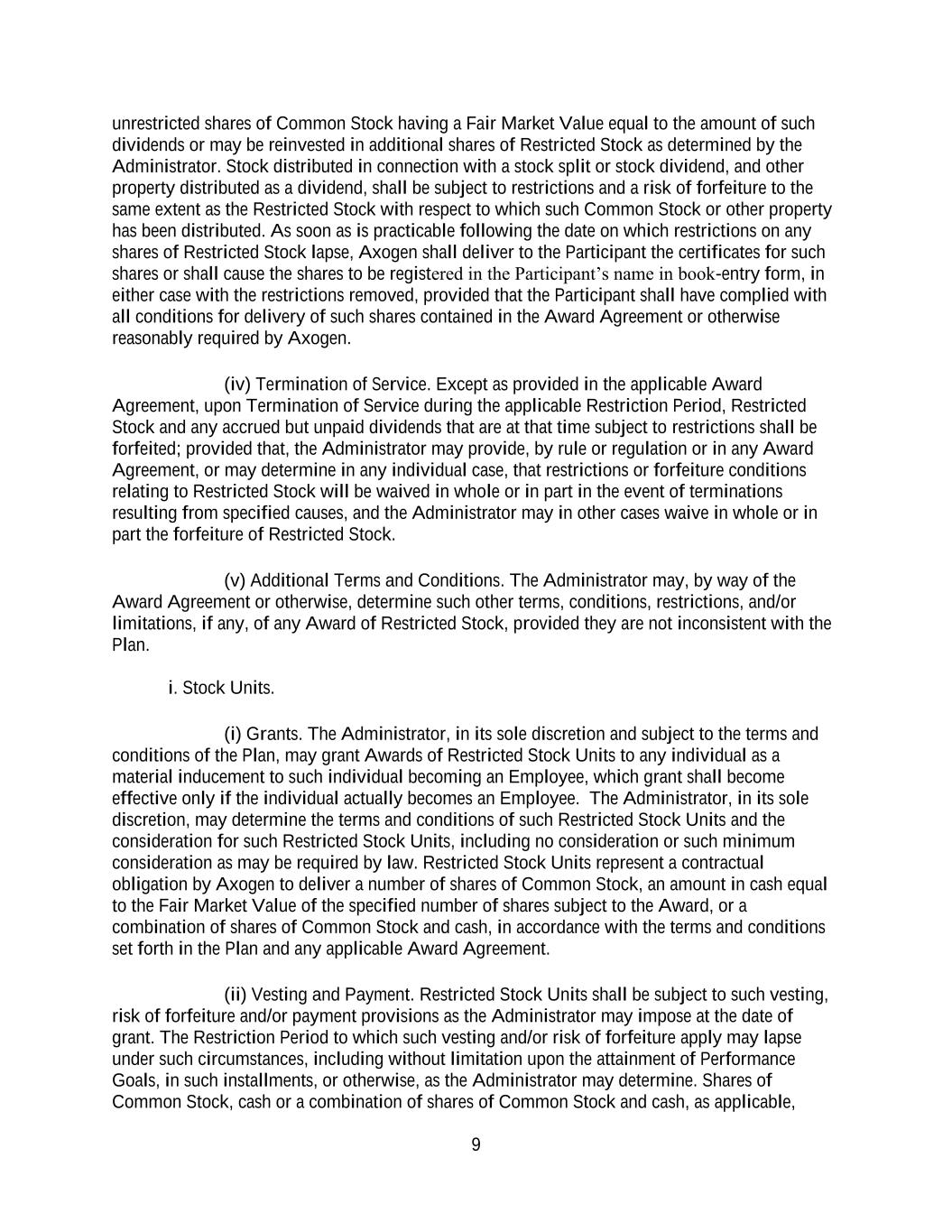 9 unrestricted shares of Common Stock having a Fair Market Value equal to the amount of such dividends or may be reinvested in additional shares of Restricted Stock as determined by the Administrator. Stock distributed in connection with a stock split or stock dividend, and other property distributed as a dividend, shall be subject to restrictions and a risk of forfeiture to the same extent as the Restricted Stock with respect to which such Common Stock or other property has been distributed. As soon as is practicable following the date on which restrictions on any shares of Restricted Stock lapse, Axogen shall deliver to the Participant the certificates for such shares or shall cause the shares to be registered in the Participant’s name in book-entry form, in either case with the restrictions removed, provided that the Participant shall have complied with all conditions for delivery of such shares contained in the Award Agreement or otherwise reasonably required by Axogen. (iv) Termination of Service. Except as provided in the applicable Award Agreement, upon Termination of Service during the applicable Restriction Period, Restricted Stock and any accrued but unpaid dividends that are at that time subject to restrictions shall be forfeited; provided that, the Administrator may provide, by rule or regulation or in any Award Agreement, or may determine in any individual case, that restrictions or forfeiture conditions relating to Restricted Stock will be waived in whole or in part in the event of terminations resulting from specified causes, and the Administrator may in other cases waive in whole or in part the forfeiture of Restricted Stock. (v) Additional Terms and Conditions. The Administrator may, by way of the Award Agreement or otherwise, determine such other terms, conditions, restrictions, and/or limitations, if any, of any Award of Restricted Stock, provided they are not inconsistent with the Plan. i. Stock Units. (i) Grants. The Administrator, in its sole discretion and subject to the terms and conditions of the Plan, may grant Awards of Restricted Stock Units to any individual as a material inducement to such individual becoming an Employee, which grant shall become effective only if the individual actually becomes an Employee. The Administrator, in its sole discretion, may determine the terms and conditions of such Restricted Stock Units and the consideration for such Restricted Stock Units, including no consideration or such minimum consideration as may be required by law. Restricted Stock Units represent a contractual obligation by Axogen to deliver a number of shares of Common Stock, an amount in cash equal to the Fair Market Value of the specified number of shares subject to the Award, or a combination of shares of Common Stock and cash, in accordance with the terms and conditions set forth in the Plan and any applicable Award Agreement. (ii) Vesting and Payment. Restricted Stock Units shall be subject to such vesting, risk of forfeiture and/or payment provisions as the Administrator may impose at the date of grant. The Restriction Period to which such vesting and/or risk of forfeiture apply may lapse under such circumstances, including without limitation upon the attainment of Performance Goals, in such installments, or otherwise, as the Administrator may determine. Shares of Common Stock, cash or a combination of shares of Common Stock and cash, as applicable,