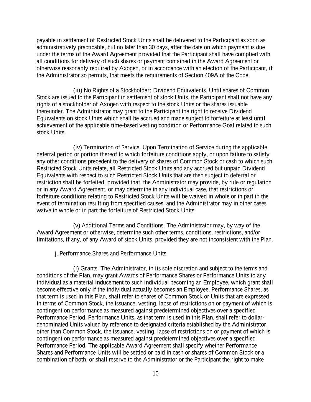 10 payable in settlement of Restricted Stock Units shall be delivered to the Participant as soon as administratively practicable, but no later than 30 days, after the date on which payment is due under the terms of the Award Agreement provided that the Participant shall have complied with all conditions for delivery of such shares or payment contained in the Award Agreement or otherwise reasonably required by Axogen, or in accordance with an election of the Participant, if the Administrator so permits, that meets the requirements of Section 409A of the Code. (iii) No Rights of a Stockholder; Dividend Equivalents. Until shares of Common Stock are issued to the Participant in settlement of stock Units, the Participant shall not have any rights of a stockholder of Axogen with respect to the stock Units or the shares issuable thereunder. The Administrator may grant to the Participant the right to receive Dividend Equivalents on stock Units which shall be accrued and made subject to forfeiture at least until achievement of the applicable time-based vesting condition or Performance Goal related to such stock Units. (iv) Termination of Service. Upon Termination of Service during the applicable deferral period or portion thereof to which forfeiture conditions apply, or upon failure to satisfy any other conditions precedent to the delivery of shares of Common Stock or cash to which such Restricted Stock Units relate, all Restricted Stock Units and any accrued but unpaid Dividend Equivalents with respect to such Restricted Stock Units that are then subject to deferral or restriction shall be forfeited; provided that, the Administrator may provide, by rule or regulation or in any Award Agreement, or may determine in any individual case, that restrictions or forfeiture conditions relating to Restricted Stock Units will be waived in whole or in part in the event of termination resulting from specified causes, and the Administrator may in other cases waive in whole or in part the forfeiture of Restricted Stock Units. (v) Additional Terms and Conditions. The Administrator may, by way of the Award Agreement or otherwise, determine such other terms, conditions, restrictions, and/or limitations, if any, of any Award of stock Units, provided they are not inconsistent with the Plan. j. Performance Shares and Performance Units. (i) Grants. The Administrator, in its sole discretion and subject to the terms and conditions of the Plan, may grant Awards of Performance Shares or Performance Units to any individual as a material inducement to such individual becoming an Employee, which grant shall become effective only if the individual actually becomes an Employee. Performance Shares, as that term is used in this Plan, shall refer to shares of Common Stock or Units that are expressed in terms of Common Stock, the issuance, vesting, lapse of restrictions on or payment of which is contingent on performance as measured against predetermined objectives over a specified Performance Period. Performance Units, as that term is used in this Plan, shall refer to dollar- denominated Units valued by reference to designated criteria established by the Administrator, other than Common Stock, the issuance, vesting, lapse of restrictions on or payment of which is contingent on performance as measured against predetermined objectives over a specified Performance Period. The applicable Award Agreement shall specify whether Performance Shares and Performance Units will be settled or paid in cash or shares of Common Stock or a combination of both, or shall reserve to the Administrator or the Participant the right to make